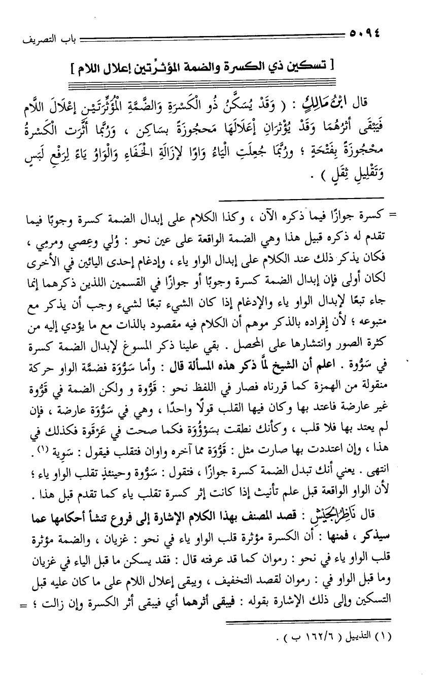 قال ابن مالك: (وقد يسكّن ذو الكسرة والضّمّة المؤثّرتين إعلال اللّام فيبقى أثرهما وقد يؤثران إعلالها محجوزة بساكن، وربّما أثّرت الكسرة محجوزة بفتحة؛ وربّما جعلت الياء واوا لإزالة الخفاء والواو ياء لرفع لبس وتقليل ثقل).