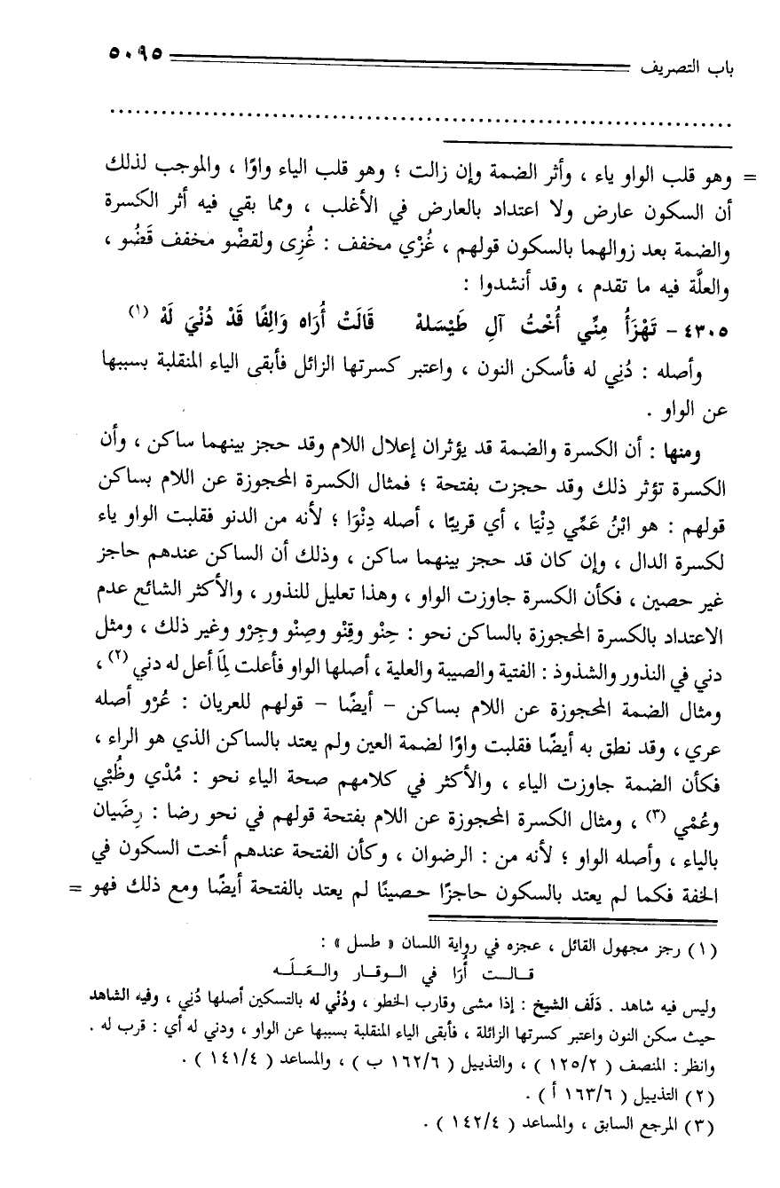 أيضا فقلبت واوا لضمة العين ولم يعتد بالساكن الذي هو الراء، فكأن الضمة جاوزت الياء، والأكثر في كلامهم صحة الياء نحو: مدي وظبي وعمي (¬3)، ومثال الكسرة المحجوزة عن اللام بفتحة قولهم في نحو رضا: رضيان بالياء، وأصله الواو؛ لأنه من: الرضوان، وكأن الفتحة عندهم أخت السكون في الخفة فكما لم يعتد بالسكون حاجزا حصينا لم يعتد بالفتحة أيضا ومع ذلك فهو -