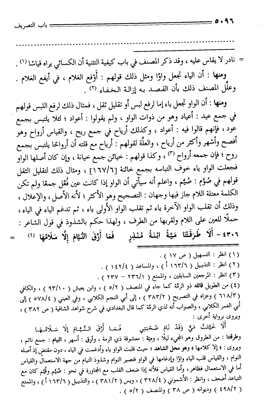 ومنها: أن الواو تجعل ياء إما لرفع لبس أو تقليل ثقل، فمثال ذلك لرفع اللبس قولهم في جمع عيد: أعياد وهو من ذوات الواو، ولم يقولوا: أعواد؛ لئلا يلتبس بجمع عود، فإنهم قالوا فيه: أعواد، وكذلك أرياح في جمع ريح، والقياس أرواح وهو أفصح وأشهر وأكثر من أرياح، والعلّة لقولهم: أرياح مع قلته أن أرواحا يلتبس بجمع روح؛ فإن جمعه أرواح (¬3)، وكذا قولهم: خيائن جمع خيانة، وإن كان أصلها الواو فجعلت الواو ياء خوف التباسه بجمع خائنة [6/ 167]، ومثال ذلك لتقليل الثقل قولهم في صوّم: صيّم، واعلم أنه سيأتي أن الواو إذا كانت عين فعّل جمعا ولم تكن الكلمة معتلة اللام جاز فيها وجهان: التصحيح وهو الأكثر؛ لأنه الأصل، والإعلال، وذلك أن تقلب الواو الآخرة ياء ثم تقلب الواو الأولى ياء، ثم تدغم الياء في الياء، حملا للعين على اللام ولقربها من الطرف، ولهذا حكم بالشذوذ في قول الشاعر: