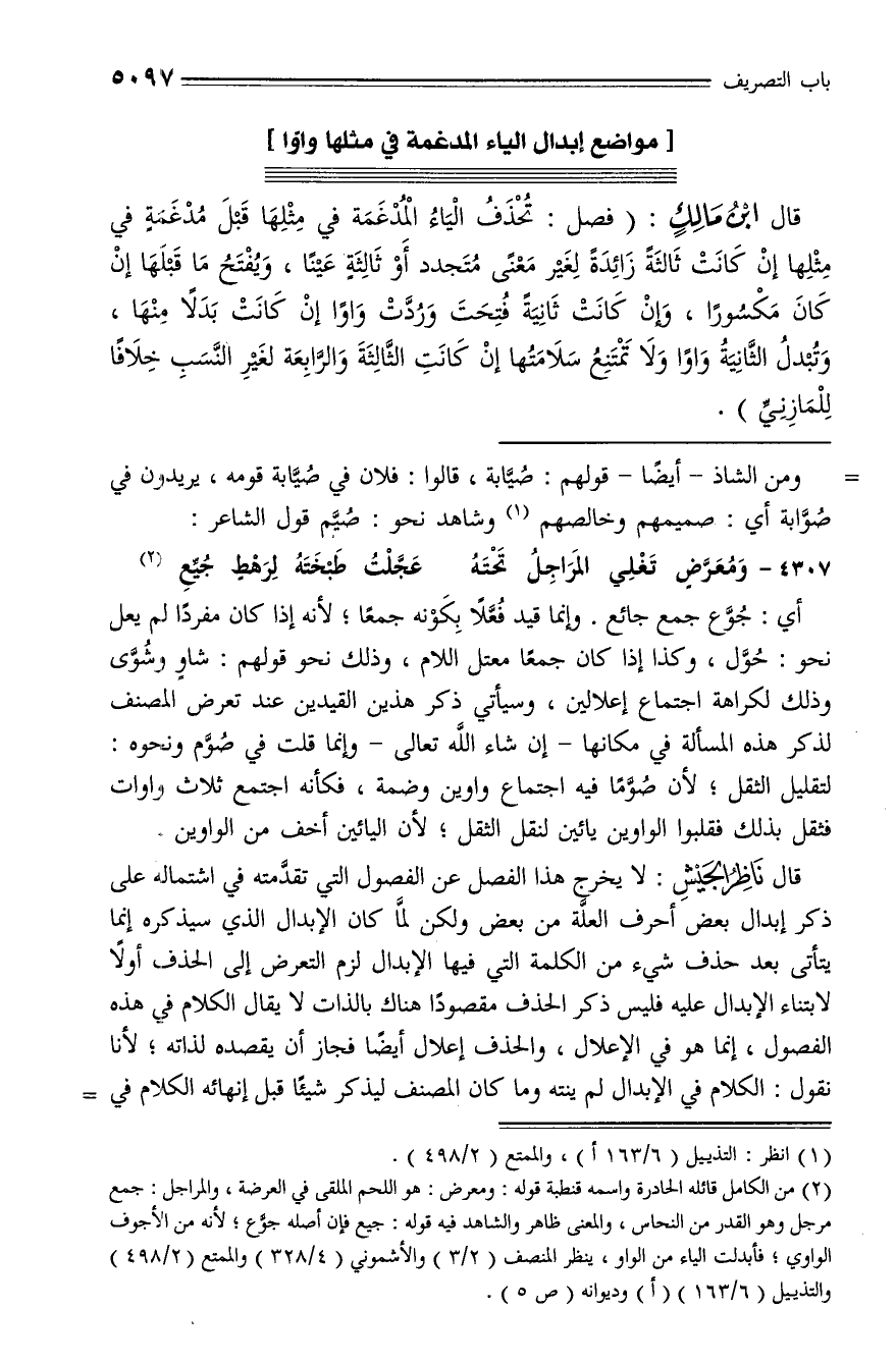 قال ابن مالك: (فصل: تحذف الياء المدغمة في مثلها قبل مدغمة في مثلها إن كانت ثالثة زائدة لغير معنى متجدد أو ثالثة عينا، ويفتح ما قبلها إن كان مكسورا، وإن كانت ثانية فتحت وردّت واوا إن كانت بدلا منها، وتبدل الثّانية واوا ولا تمتنع سلامتها إن كانت الثّالثة والرّابعة لغير النّسب خلافا للمازنيّ).