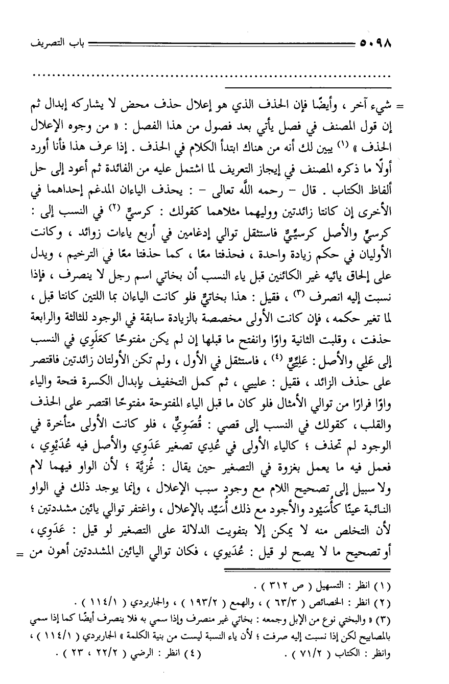 (¬3) «والبختي نوع من الإبل وجمعه: بخاتي غير منصرف وإذا سمي به فلا ينصرف أيضا كما إذا سمي بالمصابيح لكن إذا نسبت إليه صرفت؛ لأن ياء النسبة ليست من بنية الكلمة» الجاربردي (1/ 114)، وانظر: الكتاب (2/ 71).