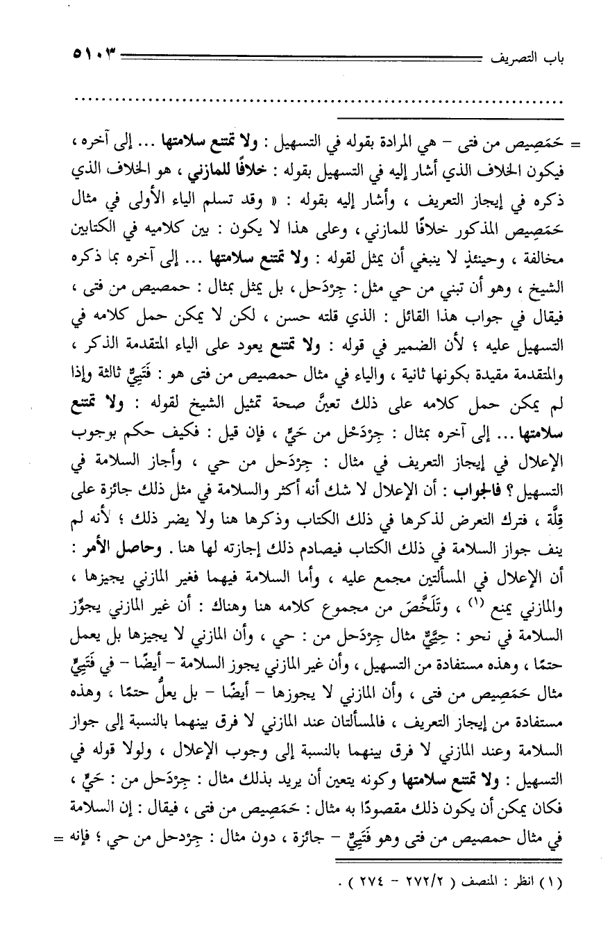 حمصيص من فتى - هي المرادة بقوله في التسهيل: ولا تمتنع سلامتها ... إلى آخره، فيكون الخلاف الذي أشار إليه في التسهيل بقوله: خلافا للمازني، هو الخلاف الذي ذكره في إيجاز التعريف، وأشار إليه بقوله: «وقد تسلم الياء الأولى في مثال حمصيص المذكور خلافا للمازني، وعلى هذا لا يكون: بين كلاميه في الكتابين مخالفة، وحينئذ لا ينبغي أن يمثل لقوله: ولا تمتنع سلامتها ... إلى آخره بما ذكره الشيخ، وهو أن تبني من حي مثل: جردحل، بل يمثل بمثال: حمصيص من فتى، فيقال في جواب هذا القائل: الذي قلته حسن، لكن لا يمكن حمل كلامه في التسهيل عليه؛ لأن الضمير في قوله: ولا تمتنع يعود على الياء المتقدمة الذكر، والمتقدمة مقيدة بكونها ثانية، والياء في مثال حمصيص من فتى هو: فتييّ ثالثة وإذا لم يمكن حمل كلامه على ذلك تعيّن صحة تمثيل الشيخ لقوله: ولا تمتنع سلامتها ... إلى آخره بمثال: جردحل من حيّ، فإن قيل: فكيف حكم بوجوب الإعلال في إيجاز التعريف في مثال: جردحل من حي، وأجاز السلامة في التسهيل؟ فالجواب: أن الإعلال لا شك أنه أكثر والسلامة في مثل ذلك جائزة على قلّة، فترك التعرض لذكرها في ذلك الكتاب وذكرها هنا ولا يضر ذلك؛ لأنه لم ينف جواز السلامة في ذلك الكتاب فيصادم ذلك إجازته لها هنا. وحاصل الأمر: