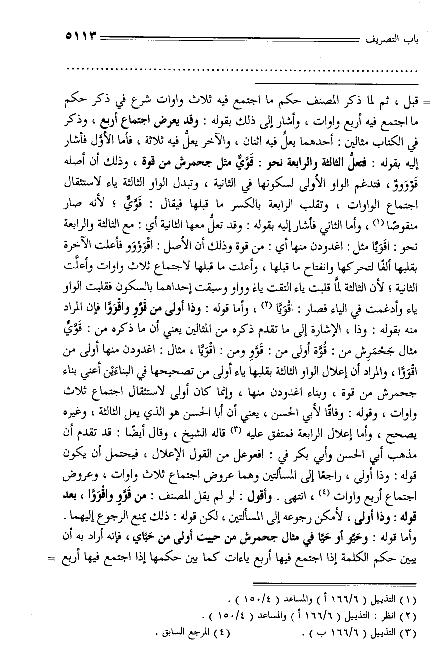 قبل، ثم لما ذكر المصنف حكم ما اجتمع فيه ثلاث واوات شرع في ذكر حكم ما اجتمع فيه أربع واوات، وأشار إلى ذلك بقوله: وقد يعرض اجتماع أربع، وذكر في الكتاب مثالين: أحدهما يعلّ فيه اثنان، والآخر يعلّ فيه ثلاثة، فأما الأوّل فأشار إليه بقوله: فتعلّ الثالثة والرابعة نحو: قوّيّ مثل جحمرش من قوة، وذلك أن أصله قوووو، فتدغم الواو الأولى لسكونها في الثانية، وتبدل الواو الثالثة ياء لاستثقال اجتماع الواوات، وتقلب الرابعة بالكسر ما قبلها فيقال: قويّ؛ لأنه صار منقوصا (¬1)، وأما الثاني فأشار إليه بقوله: وقد تعلّ معها الثانية أي: مع الثالثة والرابعة نحو: اقويّا مثل: اغدودن منها أي: من قوة وذلك أن الأصل: اقووو فأعلت الآخرة بقلبها ألفا لتحركها وانفتاح ما قبلها، وأعلت ما قبلها لاجتماع ثلاث واوات وأعلّت الثانية؛ لأن الثالثة لمّا قلبت ياء التقت ياء وواو وسبقت إحداهما بالسكون فقلبت الواو ياء وأدغمت في الياء فصار: اقويّا (¬2)، وأما قوله: وذا أولى من قوّو واقووّا فإن