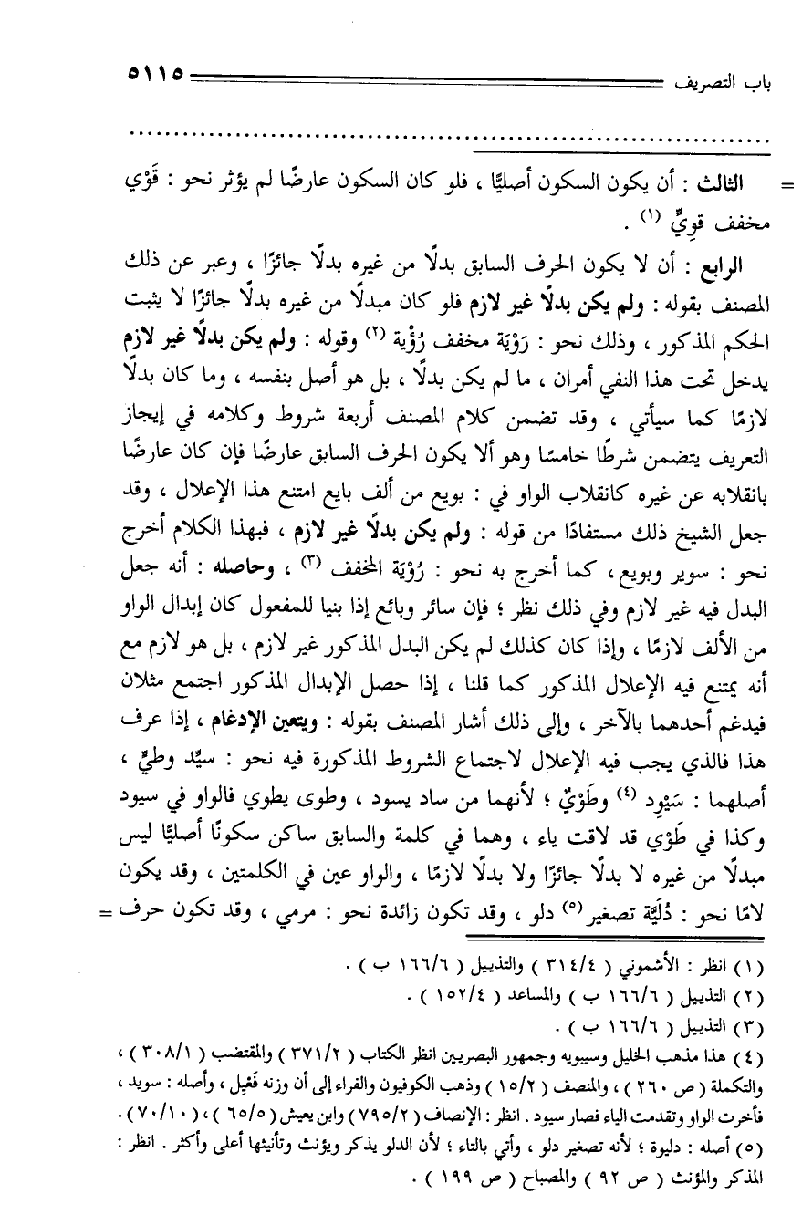 الرابع: أن لا يكون الحرف السابق بدلا من غيره بدلا جائزا، وعبر عن ذلك المصنف بقوله: ولم يكن بدلا غير لازم فلو كان مبدلا من غيره بدلا جائزا لا يثبت الحكم المذكور، وذلك نحو: روية مخفف رؤية (¬2) وقوله: ولم يكن بدلا غير لازم يدخل تحت هذا النفي أمران، ما لم يكن بدلا، بل هو أصل بنفسه، وما كان بدلا لازما كما سيأتي، وقد تضمن كلام المصنف أربعة شروط وكلامه في إيجاز التعريف يتضمن شرطا خامسا وهو ألا يكون الحرف السابق عارضا فإن كان عارضا بانقلابه عن غيره كانقلاب الواو في: بويع من ألف بايع امتنع هذا الإعلال، وقد جعل الشيخ ذلك مستفادا من قوله: ولم يكن بدلا غير لازم، فبهذا الكلام أخرج نحو: سوير وبويع، كما أخرج به نحو: روية المخفف (¬3)، وحاصله: أنه جعل البدل فيه غير لازم وفي ذلك نظر؛ فإن سائر وبائع إذا بنيا للمفعول كان إبدال الواو من الألف لازما، وإذا كان كذلك لم يكن البدل المذكور غير لازم، بل هو لازم مع أنه يمتنع فيه الإعلال المذكور كما قلنا، إذا حصل الإبدال المذكور اجتمع مثلان فيدغم أحدهما بالآخر، وإلى ذلك أشار المصنف