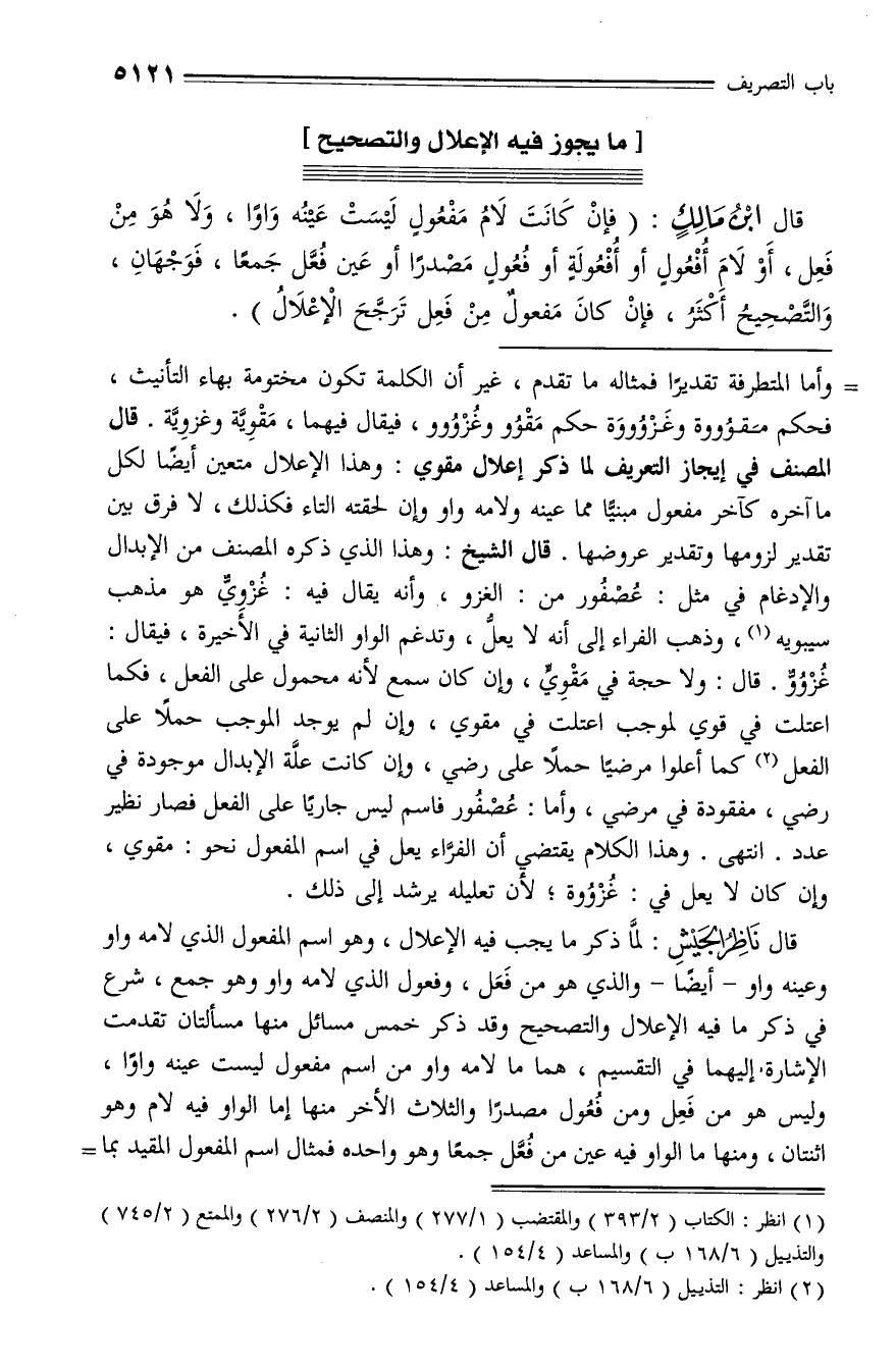 قال ابن مالك: (فإن كانت لام مفعول ليست عينه واوا، ولا هو من فعل، أو لام أفعول أو أفعولة أو فعول مصدرا أو عين فعّل جمعا، فوجهان، والتّصحيح أكثر، فإن كان مفعول من فعل ترجّح الإعلال).