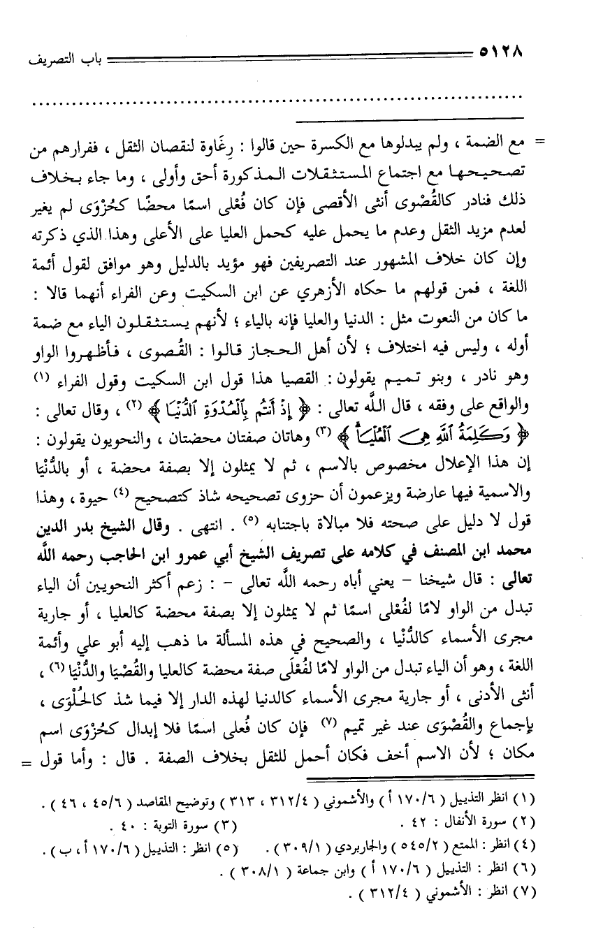 إن هذا الإعلال مخصوص بالاسم، ثم لا يمثلون إلا بصفة محضة، أو بالدّنيا والاسمية فيها عارضة ويزعمون أن حزوى تصحيحه شاذ كتصحيح (¬4) حيوة، وهذا قول لا دليل على صحته فلا مبالاة باجتنابه (¬5). انتهى. وقال الشيخ بدر الدين محمد ابن المصنف في كلامه على تصريف الشيخ أبي عمرو ابن الحاجب رحمه الله تعالى: قال