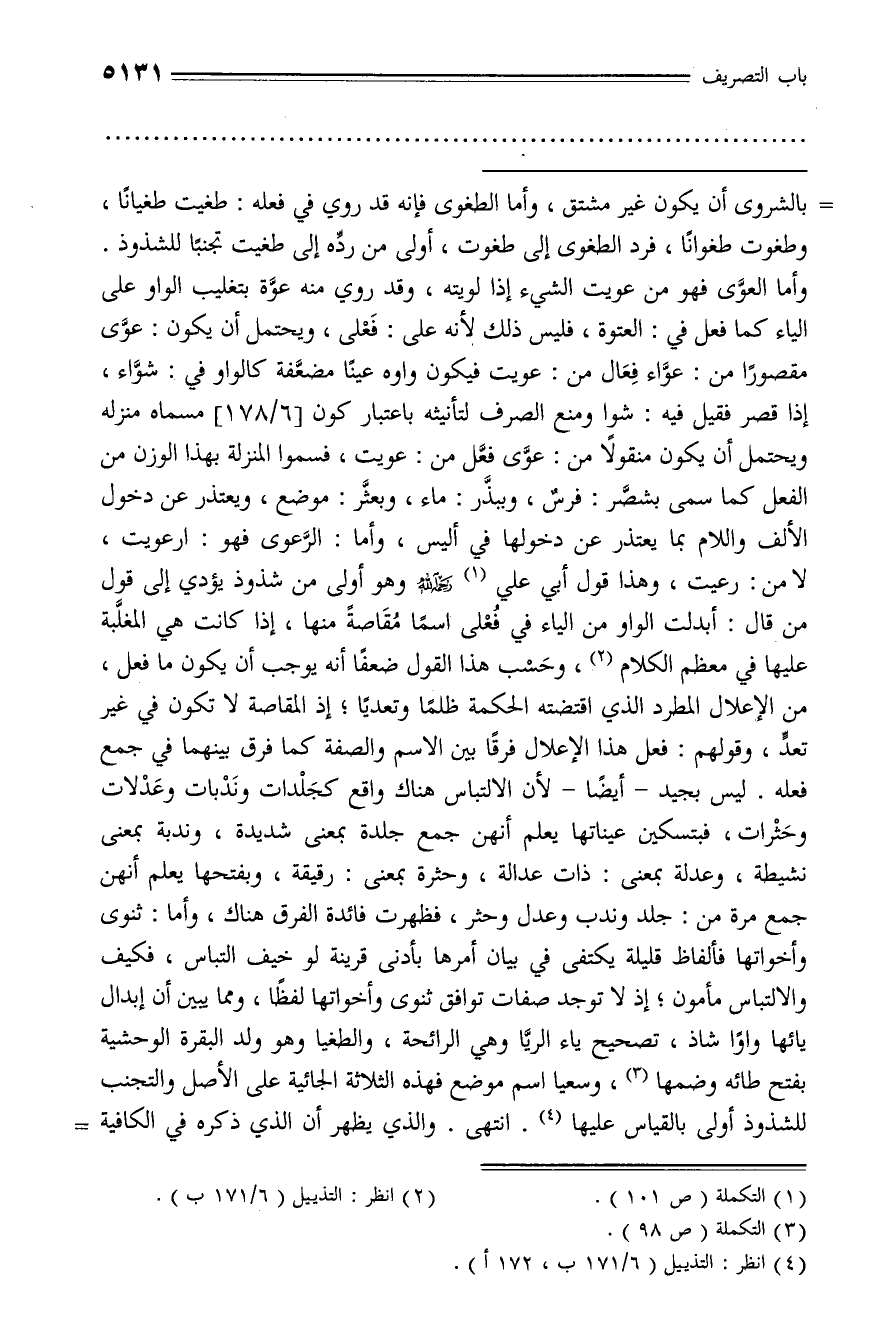 بالشروى أن يكون غير مشتق، وأما الطغوى فإنه قد روي في فعله: طغيت طغيانا، وطغوت طغوانا، فرد الطغوى إلى طغوت، أولى من ردّه إلى طغيت تجنبا للشذوذ.