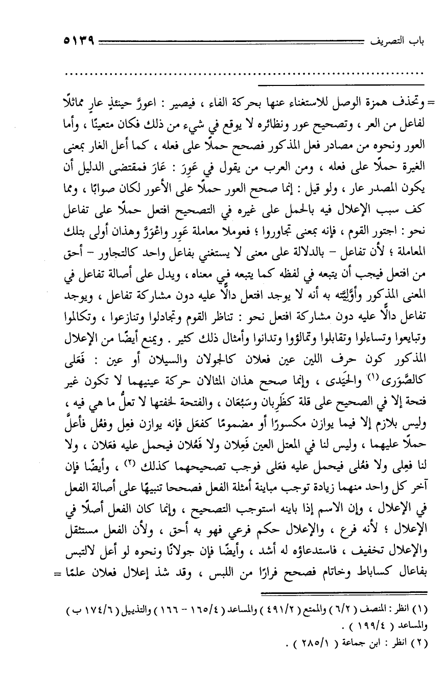 وتحذف همزة الوصل للاستغناء عنها بحركة الفاء، فيصير: اعورّ حينئذ عار مماثلا لفاعل من العر، وتصحيح عور ونظائره لا يوقع في شيء من ذلك فكان متعينا، وأما العور ونحوه من مصادر فعل المذكور فصحح حملا على فعله، كما أعل الغار بمعنى الغيرة حملا على فعله، ومن العرب من يقول في عور: عار فمقتضى الدليل أن يكون المصدر عار، ولو قيل: إنما صحح العور حملا على الأعور لكان صوابا، ومما كف سبب الإعلال فيه بالحمل على غيره في التصحيح افتعل حملا على تفاعل نحو: اجتور القوم، فإنه بمعنى تجاوروا؛ فعوملا معاملة عور واعورّ وهذان أولى بتلك المعاملة؛ لأن تفاعل - بالدلالة على معنى لا يستغني بفاعل واحد كالتجاور - أحق من افتعل