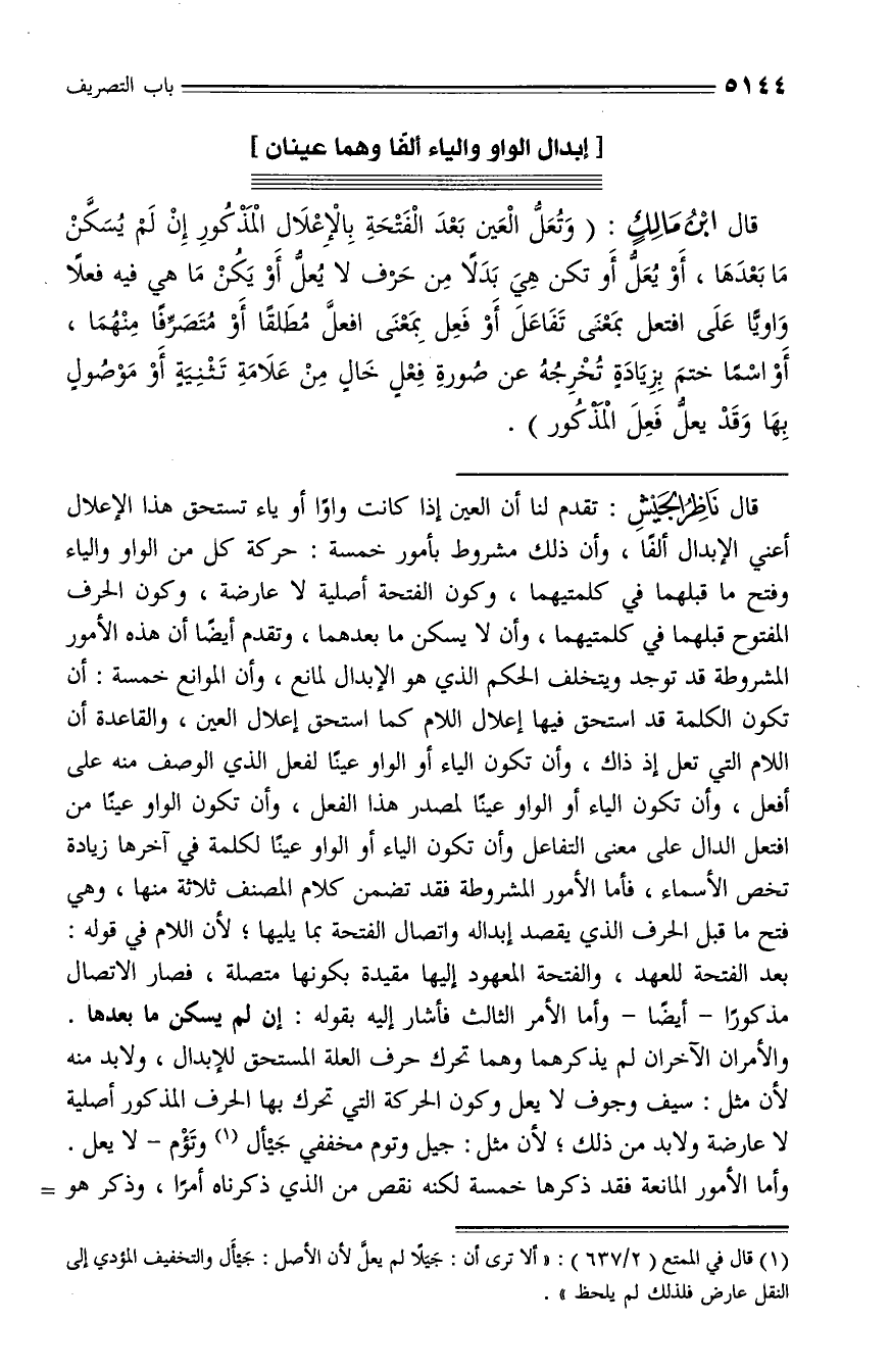 قال ناظر الجيش: تقدم لنا أن العين إذا كانت واوا أو ياء تستحق هذا الإعلال أعني الإبدال ألفا، وأن ذلك مشروط بأمور خمسة: حركة كل من الواو والياء وفتح ما قبلهما في كلمتيهما، وكون الفتحة أصلية لا عارضة، وكون الحرف المفتوح قبلهما في كلمتيهما، وأن لا يسكن ما بعدهما، وتقدم أيضا أن هذه الأمور المشروطة قد توجد ويتخلف الحكم الذي هو الإبدال لمانع، وأن الموانع خمسة: أن تكون الكلمة قد استحق فيها إعلال اللام كما استحق إعلال العين، والقاعدة أن اللام التي تعل إذ ذاك، وأن تكون الياء أو الواو عينا لفعل الذي الوصف منه على أفعل، وأن تكون الياء أو الواو عينا لمصدر هذا الفعل، وأن تكون الواو عينا من افتعل الدال على معنى التفاعل وأن تكون الياء أو الواو عينا لكلمة في آخرها زيادة تخص الأسماء، فأما الأمور المشروطة فقد تضمن كلام المصنف ثلاثة منها، وهي فتح ما قبل الحرف الذي يقصد إبداله واتصال الفتحة بما يليها؛ لأن اللام في قوله:
