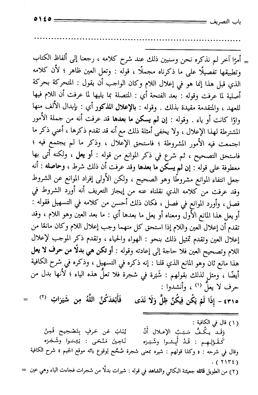 أو يعل هذا المانع الأول ومعناه أو يعل ما بعدها أي: ما بعد العين وهو اللام، وقد تقدم أن إعلال العين واللام إذا استحق كل منهما وجب إعلال اللام وكان مانعا من إعلال العين وتقدم تمثيل ذلك بنحو: الهواء والحياء، وتقدم ذكر الموجب لإعلال اللام وتصحيح العين فلا حاجة إلى إعادته وقوله: أو تكن هي بدلا من حرف لا يعل هذا مانع ثان وهو المانع الذي قلنا: إنه ذكره في التسهيل، وذكره في شرح الكافية أيضا، ومثل لذلك بقولهم: شيرة في شجرة فلا تعلّ هذه الياء؛ لأنها بدل من حرف لا يعلّ (¬1)، وأنشدوا: