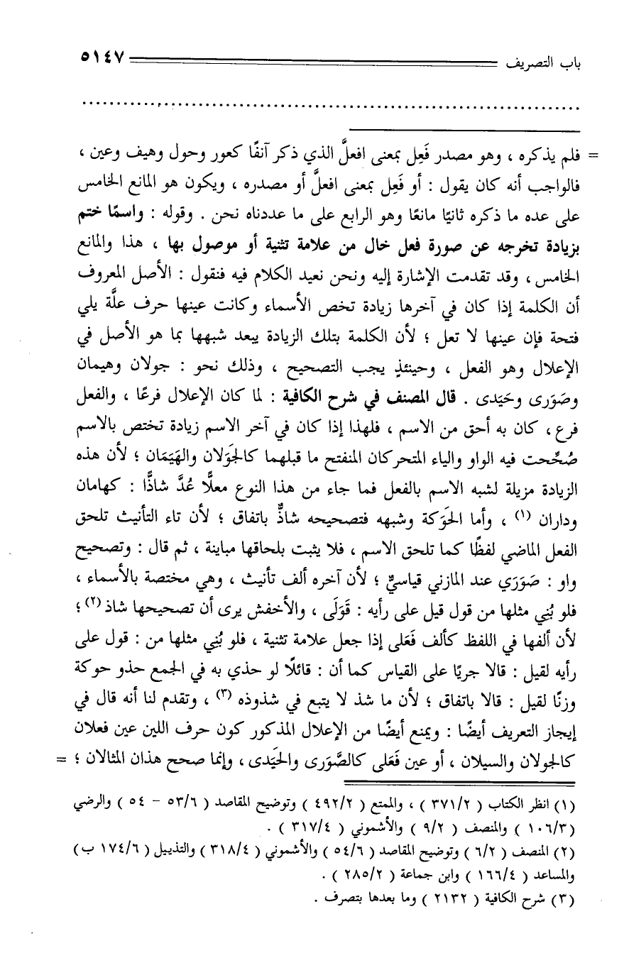 فلم يذكره، وهو مصدر فعل بمعنى افعلّ الذي ذكر آنفا كعور وحول وهيف وعين، فالواجب أنه كان يقول: أو فعل بمعنى افعلّ أو مصدره، ويكون هو المانع الخامس على عده ما ذكره ثانيا مانعا وهو الرابع على ما عددناه نحن. وقوله: واسما ختم بزيادة تخرجه عن صورة فعل خال من علامة تثنية أو موصول بها، هذا والمانع الخامس، وقد تقدمت الإشارة إليه ونحن نعيد الكلام فيه فنقول: الأصل المعروف أن الكلمة إذا كان في آخرها زيادة تخص الأسماء وكانت عينها حرف علّة يلي فتحة فإن عينها لا تعل؛ لأن الكلمة بتلك الزيادة يبعد شبهها بما هو الأصل في الإعلال وهو الفعل، وحينئذ يجب التصحيح، وذلك نحو: جولان وهيمان وصورى وحيدى. قال المصنف في شرح الكافية: لما كان الإعلال فرعا، والفعل فرع، كان به أحق من الاسم، فلهذا إذا كان في آخر الاسم زيادة تختص بالاسم صحّحت فيه الواو والياء المتحركان المنفتح ما قبلهما كالجولان والهيمان؛ لأن هذه الزيادة مزيلة لشبه الاسم بالفعل فما جاء من هذا النوع معلّا عدّ شاذّا: كهامان وداران (¬1)، وأما الحوكة وشبهه فتصحيحه شاذّ باتفاق؛ لأن تاء التأنيث تلحق الفعل الماضي لفظا كما تلحق الاسم، فلا يثبت بلحاقها مباينة، ثم قال: وتصحيح واو: صوري عند المازني قياسيّ؛ لأن آخره ألف تأنيث، وهي مختصة بالأسماء، فلو بني مثلها من قول قيل على رأيه: قولى، والأخفش يرى أن تصحيحها شاذ (¬2)؛ لأن ألفها في اللفظ كألف فعلى إذا جعل علامة تثنية، فلو بني مثلها من: قول على رأيه لقيل: قالا جريا على القياس كما أن: قائلا لو حذي به في الجمع حذو حوكة وزنا لقيل: قالا باتفاق؛ لأن ما شذ لا يتبع في شذوذه (¬3)، وتقدم لنا أنه قال في إيجاز التعريف أيضا: ويمنع أيضا من الإعلال المذكور كون حرف اللين عين فعلان كالجولان والسيلان، أو عين فعلى كالصّورى والحيدى، وإنما صحح هذان