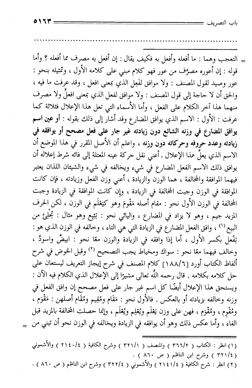 تفعل بكسر الأول، أما إذا وافقه في الزيادة والوزن معا نحو: ابيضّ واسودّ، وخالف فيهما معا نحو: سواك ومخياط يجب التصحيح (¬2) وقبل الخوض في شرح ألفاظ الكتاب أورد [6/ 188] كلام المصنف في شرح إيجاز التعريف ليستعان على حل كلامه بكلامه. قال رحمه الله تعالى مشيرا إلى الإعلال الذي الكلام فيه الآن: