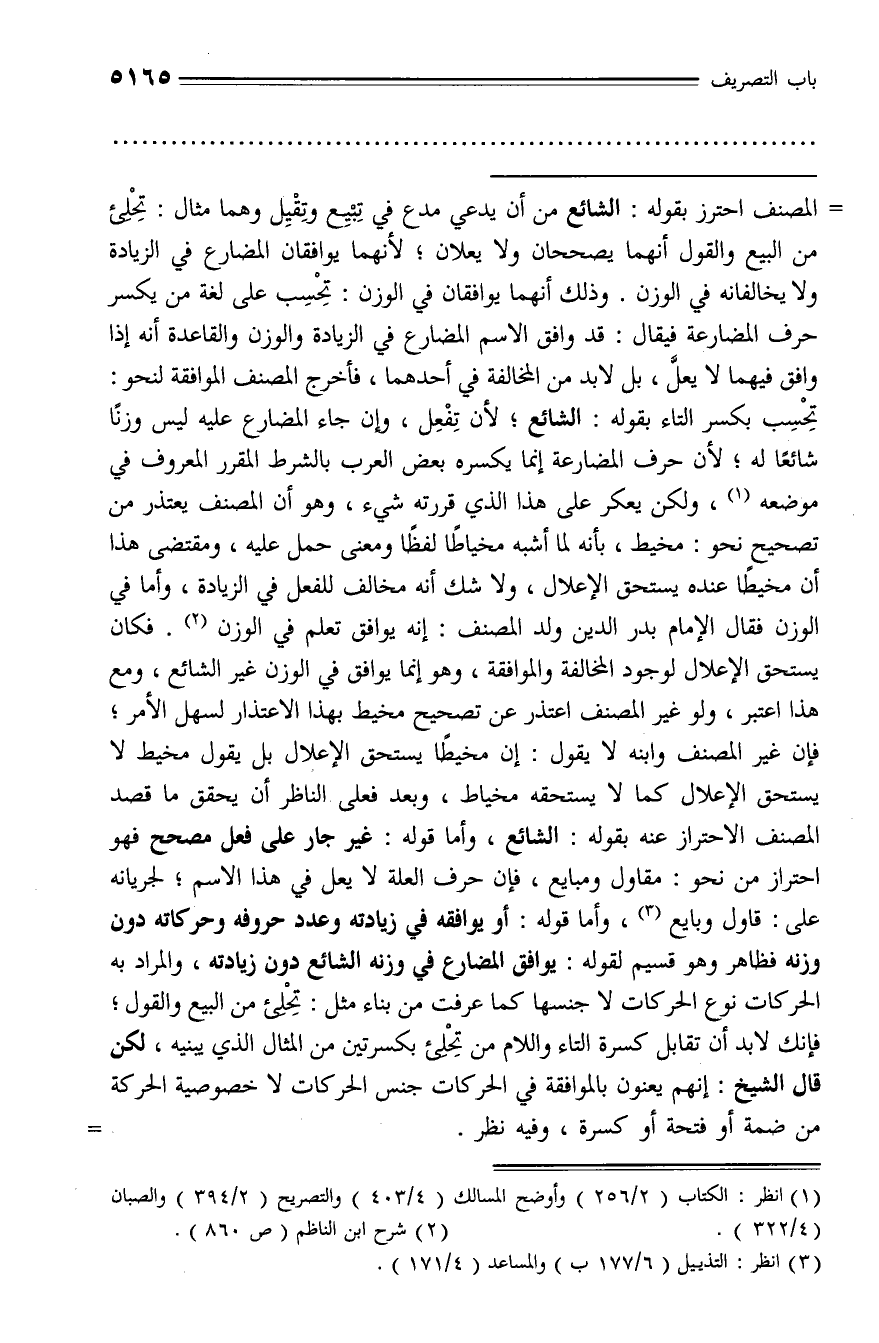 تحسب بكسر التاء بقوله: الشائع؛ لأن تفعل، وإن جاء المضارع عليه ليس وزنا شائعا له؛ لأن حرف المضارعة إنما يكسره بعض العرب بالشرط المقرر المعروف في موضعه (¬1)، ولكن يعكر على هذا الذي قررته شيء، وهو أن المصنف يعتذر من تصحيح نحو: مخيط، بأنه لما أشبه مخياطا لفظا ومعنى حمل عليه، ومقتضى هذا أن مخيطا عنده يستحق الإعلال، ولا شك أنه مخالف للفعل في الزيادة، وأما في الوزن فقال الإمام بدر الدين ولد المصنف: إنه يوافق تعلم في الوزن (¬2). فكان يستحق الإعلال لوجود المخالفة والموافقة، وهو إنما يوافق في الوزن غير الشائع، ومع هذا اعتبر، ولو غير المصنف اعتذر عن تصحيح مخيط بهذا الاعتذار لسهل الأمر؛ فإن غير المصنف وابنه لا يقول: إن مخيطا يستحق الإعلال بل يقول مخيط لا يستحق الإعلال كما لا يستحقه مخياط، وبعد فعلى الناظر أن يحقق ما قصد المصنف الاحتراز عنه بقوله: الشائع، وأما قوله: غير جار على فعل مصحح فهو احتراز من نحو: مقاول ومبايع، فإن حرف العلة لا يعل في هذا الاسم؛ لجريانه على: قاول وبايع (¬3)، وأما قوله: أو يوافقه في زيادته وعدد حروفه وحركاته دون وزنه فظاهر وهو قسيم لقوله: يوافق المضارع في وزنه الشائع دون زيادته، والمراد به الحركات نوع الحركات لا جنسها كما عرفت من بناء مثل: تحلئ من البيع والقول؛ فإنك لا بد أن تقابل كسرة التاء واللام من تحلئ بكسرتين من المثال الذي يبنيه، لكن قال الشيخ: إنهم يعنون بالموافقة في الحركات جنس الحركات لا خصوصية الحركة من ضمة أو فتحة أو كسرة، وفيه نظر. -