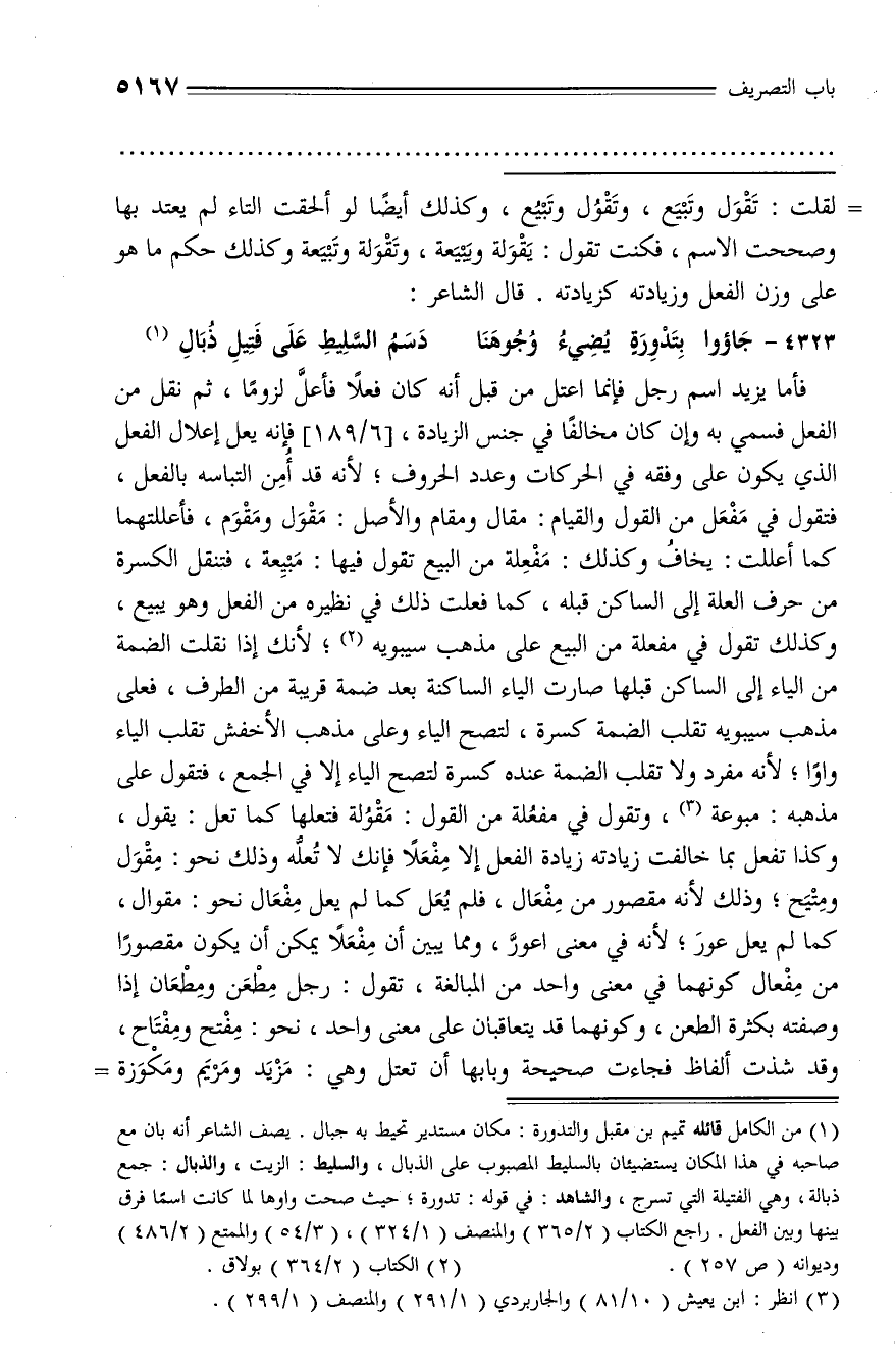 (¬1) من الكامل قائله تميم بن مقبل والتدورة: مكان مستدير تحيط به جبال. يصف الشاعر أنه بان مع صاحبه في هذا المكان يستضيئان بالسليط المصبوب على الذبال، والسليط: الزيت، والذبال: جمع ذبالة، وهي الفتيلة التي تسرج، والشاهد: في قوله: تدورة؛ حيث صحت واوها لما كانت اسما فرق بينها وبين الفعل. راجع الكتاب (2/ 365) والمنصف (1/ 324)، (3/ 54) والممتع (2/ 486) وديوانه (ص 257).