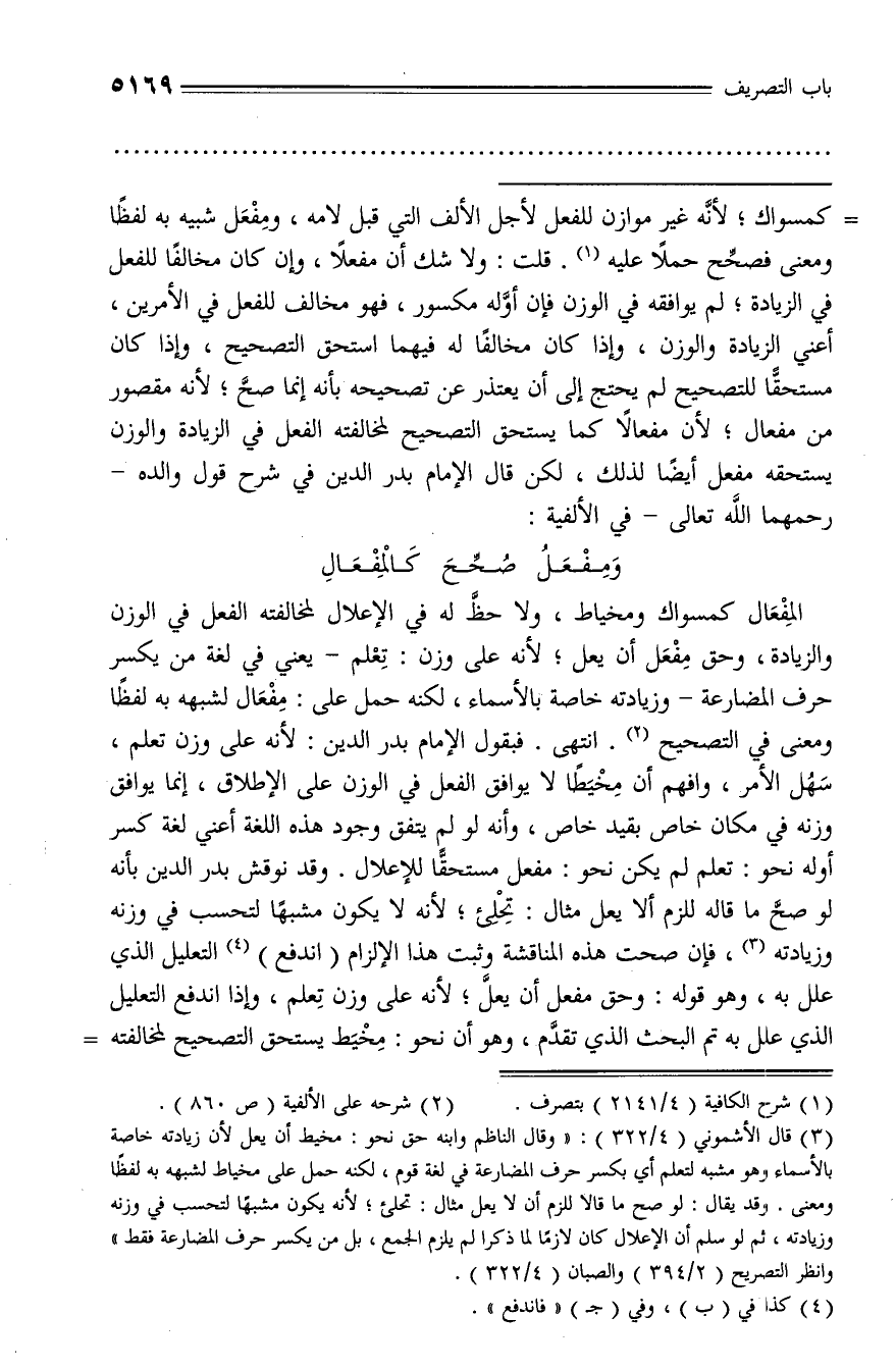 (¬3) قال الأشموني (4/ 322): «وقال الناظم وابنه حق نحو: مخيط أن يعل لأن زيادته خاصة بالأسماء وهو مشبه لتعلم أي بكسر حرف المضارعة في لغة قوم، لكنه حمل على مخياط لشبهه به لفظا ومعنى. وقد يقال: لو صح ما قالا للزم أن لا يعل مثال: تحلئ؛ لأنه يكون مشبها لتحسب في وزنه وزيادته، ثم لو سلم أن الإعلال كان لازما لما ذكرا لم يلزم الجمع، بل من يكسر حرف المضارعة فقط» وانظر التصريح (2/ 394) والصبان (4/ 322).