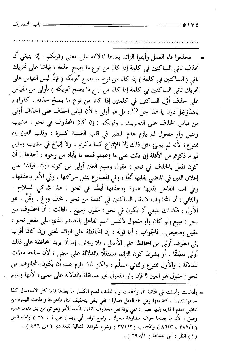 فحذفوا فاء العمل وأبقوا الزائد بعدها لدلالته على معنى وقولكم: إنه ينبغي أن تحذف ثاني الساكنين في كلمة إذا كانا من نوع ما يصح حذفه، قياسا على تحريك ثاني (الساكنين في كلمة) إذا كانا من نوع ما يصح تحريكه (فإذا ليس القياس على تحريك ثاني الساكنين في كلمة إذا كانا من نوع ما يصح تحريكه) بأولى من القياس على حذف أوّل الساكنين في كلمتين إذا كانا من نوع ما يصحّ حذفه. كقولهم ياهذوجل دون يا هذا جل (¬1)، بل هو أولى؛ لأن قياس الحذف على الحذف أولى من قياس الحذف على التحريك. وقولكم: إن كان المحذوف في نحو: مشيب ومنيل واو مفعول لم يلزم عدم النظير في قلب الضمة كسرة، وقلب العين ياء ممنوع؛ لأنه لم يجئ مثل ذلك إلا للإتباع كما ذكرتم، ولا إتباع في مشيب ومنيل ثم ما ذكرتم من الأدلة إن دلت على ما زعمتم فمعه ما يأباه من وجوه: أحدها: أن كون المعل بالحذف في نحو: مقول ومبيع العين أولى من كونه الزائد قياسا على إعلال العين في الماضي بقلبها ألفا، وفي المضارع بنقل حركتها، وفي الأمر بحذفها، وفي اسم الفاعل بقلبها همزة وبحذفها أيضا في نحو: هذا شاكي السلاح.