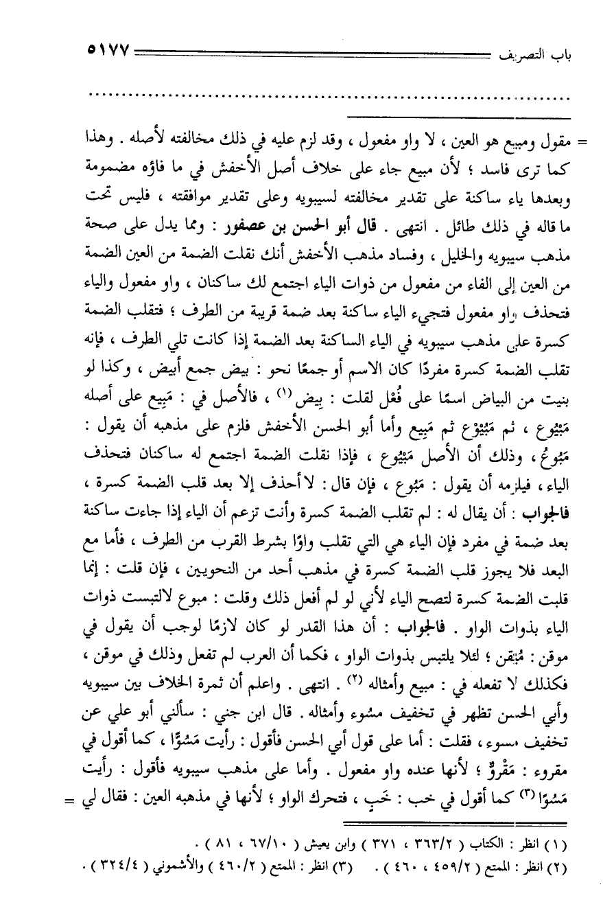 مبوع، وذلك أن الأصل مبيوع، فإذا نقلت الضمة اجتمع له ساكنان فتحذف الياء، فيلزمه أن يقول: مبوع، فإن قال: لا أحذف إلا بعد قلب الضمة كسرة، فالجواب: أن يقال له: لم تقلب الضمة كسرة وأنت تزعم أن الياء إذا جاءت ساكنة بعد ضمة في مفرد فإن الياء هي التي تقلب واوا بشرط القرب من الطرف، فأما مع البعد فلا يجوز قلب الضمة كسرة في مذهب أحد من النحويين، فإن قلت: إنما قلبت الضمة كسرة لتصح الياء لأني لو لم أفعل ذلك وقلت: مبوع لالتبست ذوات الياء بذوات الواو. فالجواب: أن هذا القدر لو كان لازما لوجب أن يقول في موقن: ميقن؛ لئلا يلتبس بذوات الواو، فكما أن العرب لم تفعل وذلك في موقن، فكذلك لا تفعله في: مبيع وأمثاله (¬2). انتهى. واعلم أن ثمرة الخلاف بين سيبويه وأبي الحسن تظهر في تخفيف مسوء وأمثاله. قال ابن جني: سألني أبو علي عن تخفيف