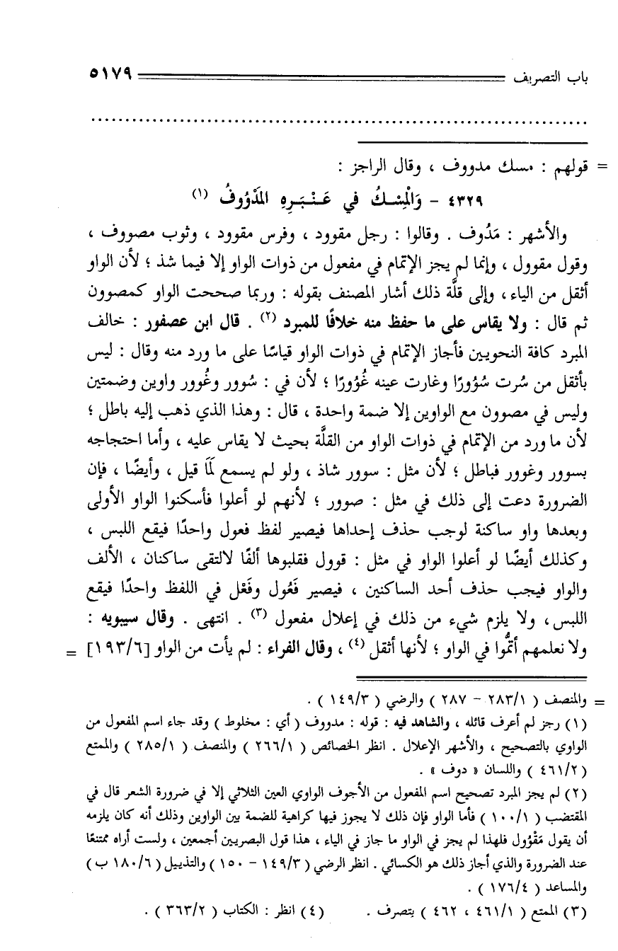 والأشهر: مدوف. وقالوا: رجل مقوود، وفرس مقوود، وثوب مصووف، وقول مقوول، وإنما لم يجز الإتمام في مفعول من ذوات الواو إلا فيما شذ؛ لأن الواو أثقل من الياء، وإلى قلّة ذلك أشار المصنف بقوله: وربما صححت الواو كمصوون ثم قال: ولا يقاس على ما حفظ منه خلافا للمبرد (¬2). قال ابن عصفور: خالف المبرد كافة النحويين فأجاز الإتمام في ذوات الواو قياسا على ما ورد منه وقال: ليس بأثقل من سرت سوورا وغارت عينه غوورا؛ لأن في: سوور وغوور واوين وضمتين وليس في مصوون مع الواوين إلا ضمة واحدة، قال: وهذا الذي ذهب إليه باطل؛ لأن ما ورد من الإتمام في ذوات الواو من القلّة بحيث لا يقاس عليه، وأما احتجاجه بسوور وغوور فباطل؛ لأن مثل: سوور شاذ، ولو لم يسمع لما قيل، وأيضا، فإن الضرورة دعت إلى ذلك في مثل: صوور؛ لأنهم لو أعلوا فأسكنوا الواو الأولى وبعدها واو ساكنة لوجب حذف إحداها فيصير لفظ فعول واحدا فيقع اللبس، وكذلك أيضا لو أعلوا الواو في مثل: قوول فقلبوها ألفا لالتقى ساكنان، الألف والواو فيجب حذف أحد الساكنين، فيصير فعول وفعل في اللفظ واحدا فيقع اللبس، ولا يلزم شيء من ذلك في إعلال مفعول (¬3). انتهى. وقال سيبويه: