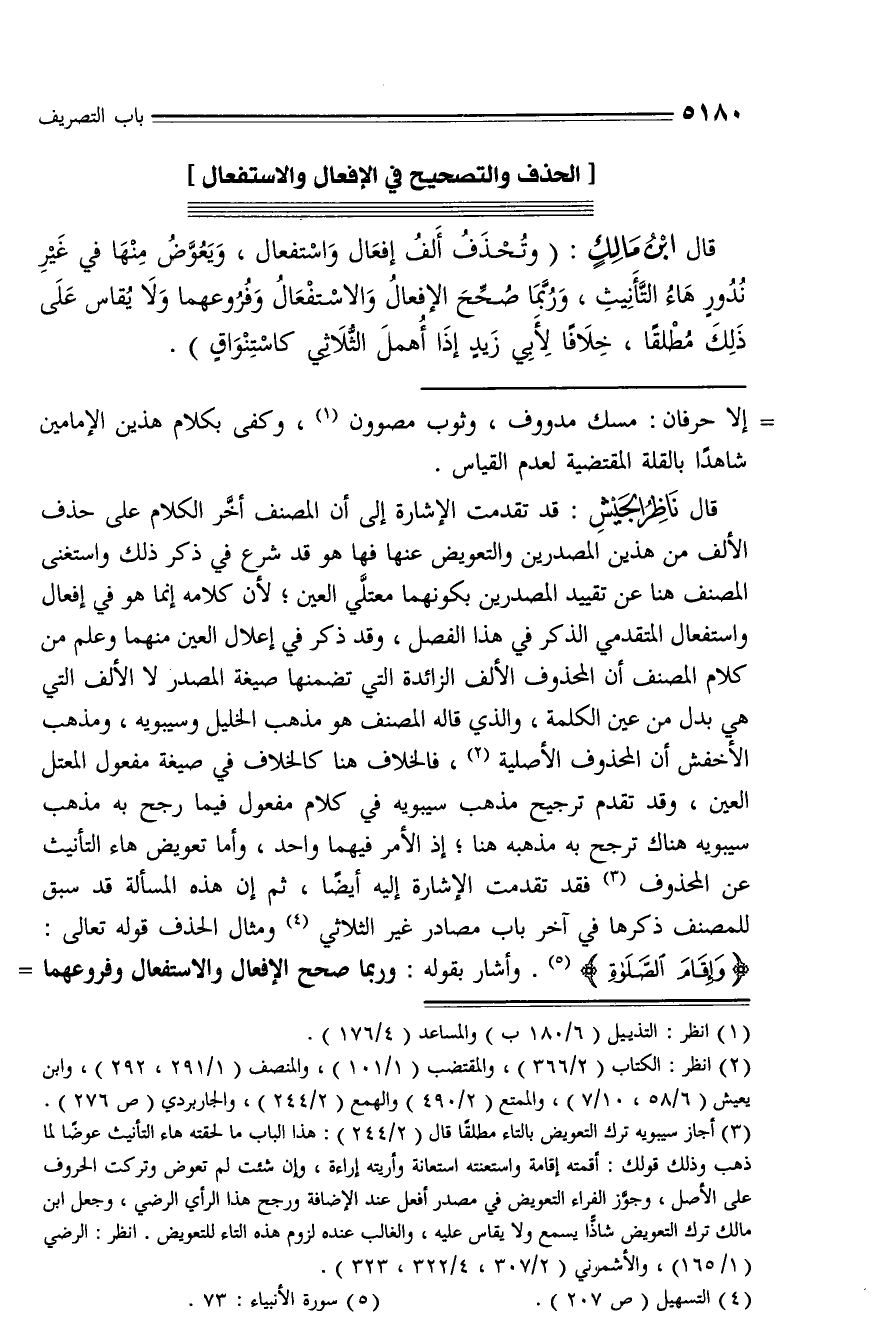 قال ناظر الجيش: قد تقدمت الإشارة إلى أن المصنف أخّر الكلام على حذف الألف من هذين المصدرين والتعويض عنها فها هو قد شرع في ذكر ذلك واستغنى المصنف هنا عن تقييد المصدرين بكونهما معتلّي العين؛ لأن كلامه إنما هو في إفعال واستفعال المتقدمي الذكر في هذا الفصل، وقد ذكر في إعلال العين منهما وعلم من كلام المصنف أن المحذوف الألف الزائدة التي تضمنها صيغة المصدر لا الألف التي هي بدل من عين الكلمة، والذي قاله المصنف هو مذهب الخليل وسيبويه، ومذهب الأخفش أن المحذوف الأصلية (¬2)، فالخلاف هنا كالخلاف في صيغة مفعول المعتل العين، وقد تقدم ترجيح مذهب سيبويه في كلام مفعول فيما رجح به مذهب سيبويه هناك ترجح به مذهبه هنا؛ إذ الأمر فيهما واحد، وأما تعويض هاء التأنيث عن المحذوف (¬3) فقد تقدمت الإشارة إليه أيضا، ثم إن هذه المسألة قد سبق للمصنف ذكرها في آخر باب مصادر غير الثلاثي (¬4) ومثال الحذف قوله تعالى: