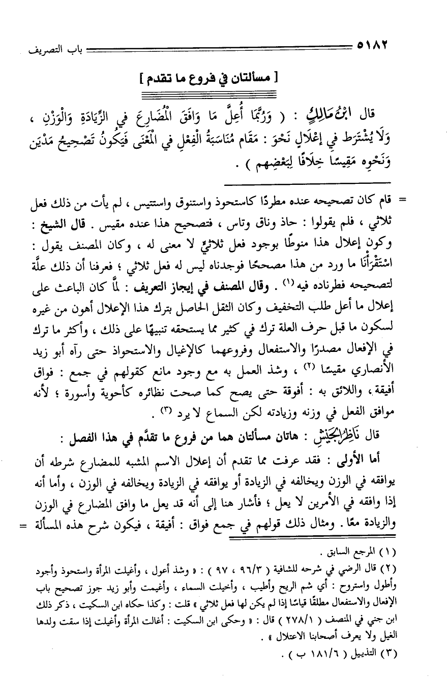 قال ابن مالك: (وربّما أعلّ ما وافق المضارع في الزّيادة والوزن، ولا يشترط في إعلال نحو: مقام مناسبة الفعل في المعنى فيكون تصحيح مدين ونحوه مقيسا خلافا لبعضهم).