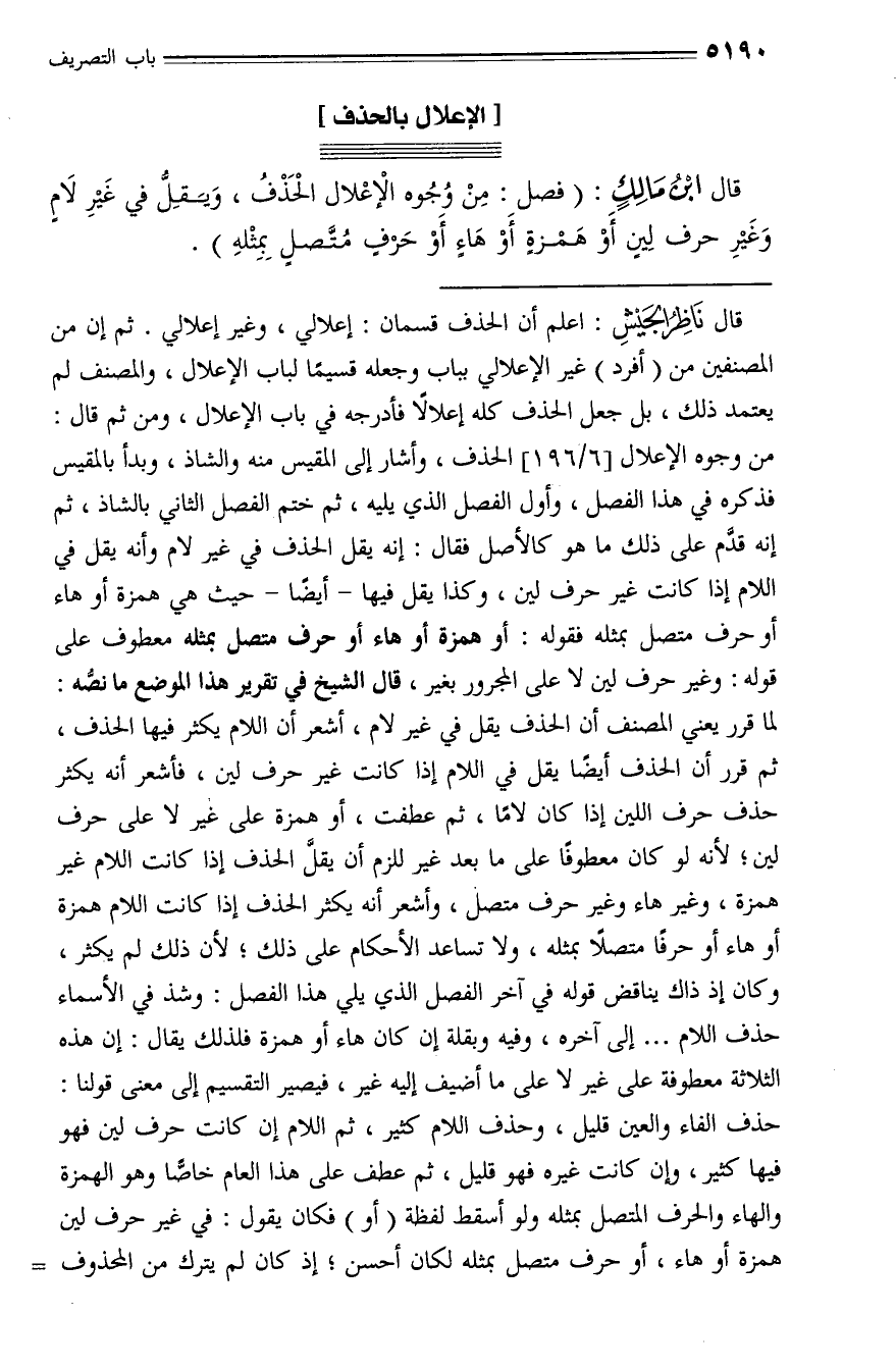 من وجوه الإعلال [6/ 196] الحذف، وأشار إلى المقيس منه والشاذ، وبدأ بالمقيس فذكره في هذا الفصل، وأول الفصل الذي يليه، ثم ختم الفصل الثاني بالشاذ، ثم إنه قدّم على ذلك ما هو كالأصل فقال: إنه يقل الحذف في غير لام وأنه يقل في اللام إذا كانت غير حرف لين، وكذا يقل فيها - أيضا - حيث هي همزة أو هاء أو حرف متصل بمثله فقوله: أو همزة أو هاء أو حرف متصل بمثله معطوف على قوله: وغير حرف لين لا على المجرور بغير، قال الشيخ في تقرير هذا الموضع ما نصّه: