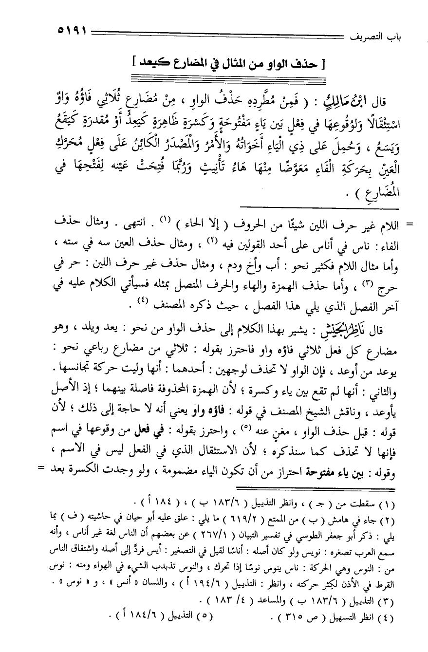قال ناظر الجيش: يشير بهذا الكلام إلى حذف الواو من نحو: يعد ويلد، وهو مضارع كل فعل ثلاثي فاؤه واو فاحترز بقوله: ثلاثي من مضارع رباعي نحو:
