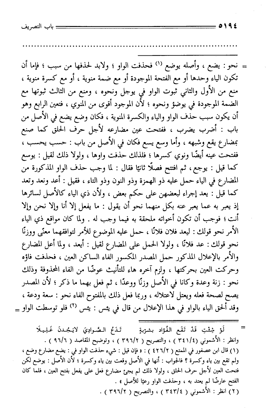 (¬1) قال ابن عصفور في الممتع (2/ 426): «فإن قيل: شيء حذفت الواو في: يضع مضارع وضع، ولم تقع بين ياء وكسرة؟ فالجواب: أنها في الأصل وقعت بين ياء وكسرة؛ لأن الأصل: يوضع لكن فتحت العين لأجل حرف الحلق، ولولا ذلك لم يجئ مضارع فعل على يفعل بفتح العين، فلما كان الفتح عارضا لم يعتد به، وحذفت الواو رعيا للأصل».