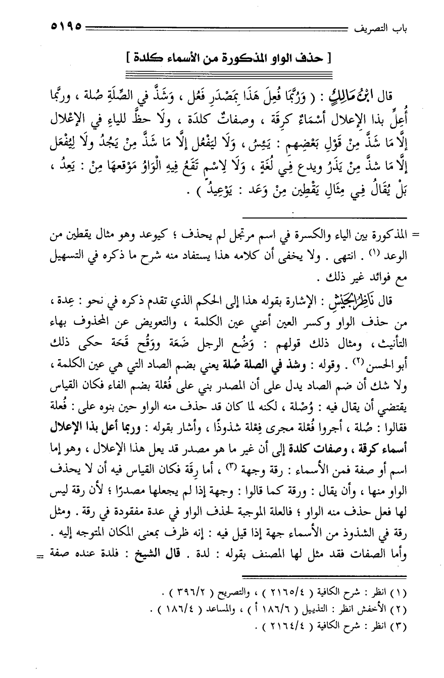 قال ناظر الجيش: الإشارة بقوله هذا إلى الحكم الذي تقدم ذكره في نحو: عدة، من حذف الواو وكسر العين أعني عين الكلمة، والتعويض عن المحذوف بهاء التأنيث، ومثال ذلك قولهم: وضع الرجل ضعة ووقح قحة حكى ذلك أبو الحسن (¬2). وقوله: وشذ في الصلة صلة يعني بضم الصاد التي هي عين الكلمة، ولا شك أن ضم الصاد يدل على أن المصدر بني على فعلة بضم الفاء فكان القياس يقتضي أن يقال فيه: وصلة، لكنه لما كان قد حذف منه الواو حين بنوه على: فعلة فقالوا: صلة، أجروا فعلة مجرى فعلة شذوذا، وأشار بقوله: وربما أعل بذا الإعلال أسماء كرقة، وصفات كلدة إلى أن غير ما هو مصدر قد يعل هذا الإعلال، وهو إما اسم أو صفة فمن الأسماء: رقة وجهة (¬3)، أما رقة فكان القياس فيه أن لا يحذف الواو منها، وأن يقال: ورقة كما قالوا: وجهة إذا لم يجعلها مصدرا؛ لأن رقة ليس لها فعل حذف منه الواو؛ فالعلة الموجبة لحذف الواو في عدة مفقودة في رقة. ومثل رقة في الشذوذ من الأسماء جهة إذا قيل فيه: إنه ظرف بمعنى المكان المتوجه إليه.