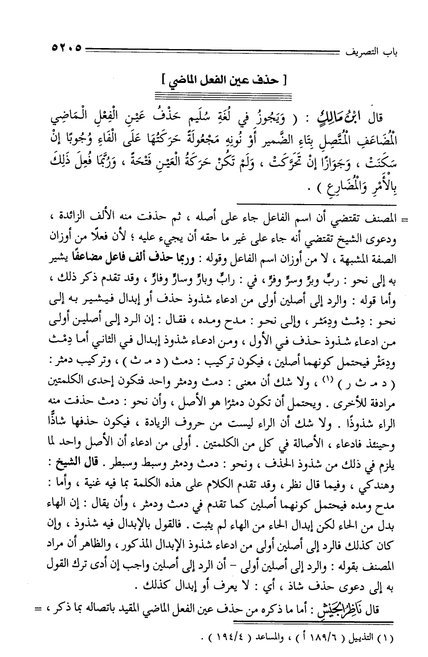 قال ناظر الجيش: أما ما ذكره من حذف عين الفعل الماضي المقيد باتصاله بما ذكر، -