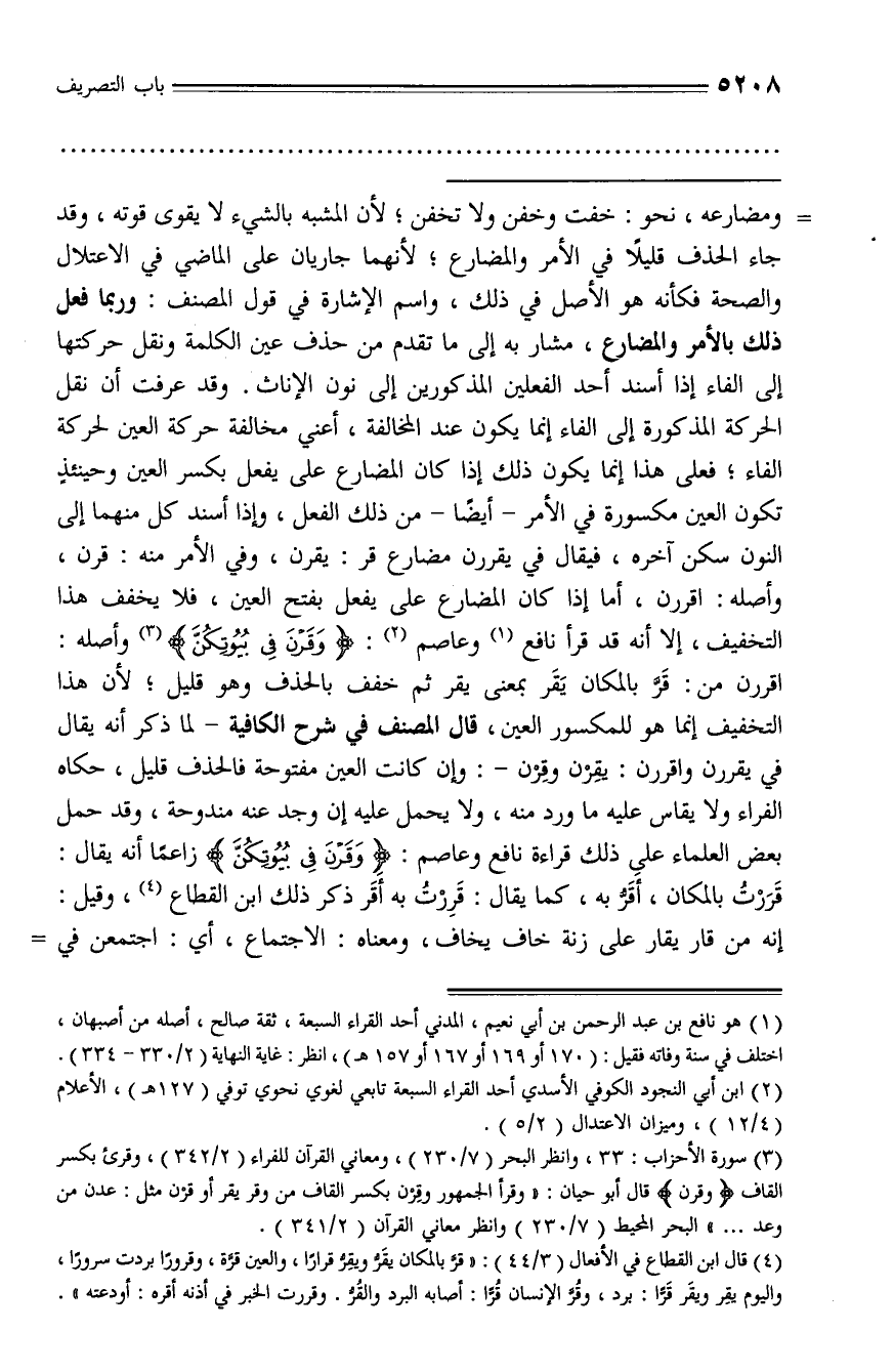 ومضارعه، نحو: خفت وخفن ولا تخفن؛ لأن المشبه بالشيء لا يقوى قوته، وقد جاء الحذف قليلا في الأمر والمضارع؛ لأنهما جاريان على الماضي في الاعتلال والصحة فكأنه هو الأصل في ذلك، واسم الإشارة في قول المصنف: وربما فعل ذلك بالأمر والمضارع، مشار به إلى ما تقدم من حذف عين الكلمة ونقل حركتها إلى الفاء إذا أسند أحد الفعلين المذكورين إلى نون الإناث. وقد عرفت أن نقل الحركة المذكورة إلى الفاء إنما يكون عند المخالفة، أعني مخالفة حركة العين لحركة الفاء؛ فعلى هذا إنما يكون ذلك إذا كان المضارع على يفعل بكسر العين وحينئذ تكون العين مكسورة في الأمر - أيضا - من ذلك الفعل، وإذا أسند كل منهما إلى النون سكن آخره، فيقال في يقررن مضارع قر: يقرن، وفي الأمر منه: قرن، وأصله: اقررن، أما إذا كان المضارع على يفعل بفتح العين، فلا يخفف هذا التخفيف، إلا أنه قد قرأ نافع (¬1) وعاصم (¬2): وقرن فى بيوتكن (¬3) وأصله: