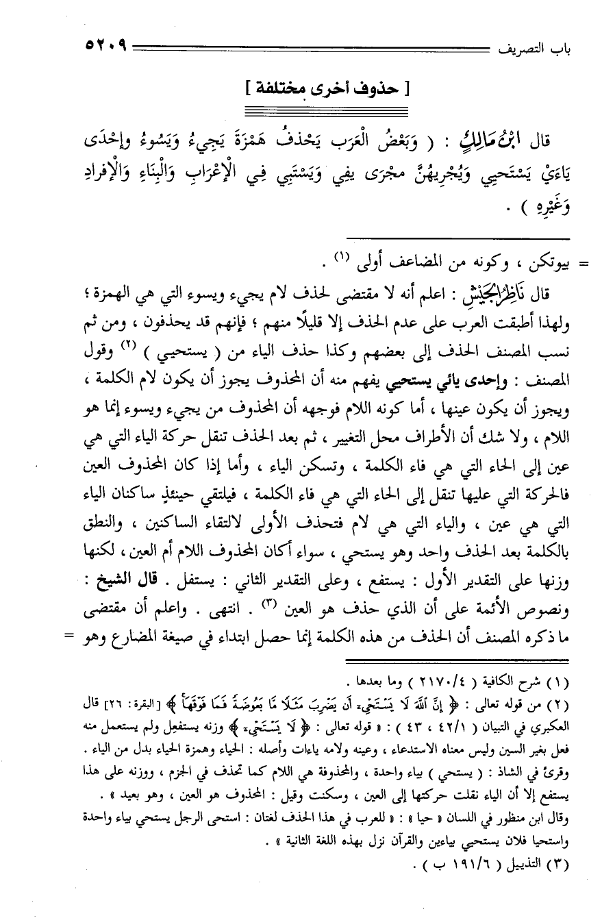 قال ناظر الجيش: اعلم أنه لا مقتضى لحذف لام يجيء ويسوء التي هي الهمزة؛ ولهذا أطبقت العرب على عدم الحذف إلا قليلا منهم؛ فإنهم قد يحذفون، ومن ثم نسب المصنف الحذف إلى بعضهم وكذا حذف الياء من (يستحيي) (¬2) وقول المصنف: وإحدى يائي يستحيي يفهم منه أن المحذوف يجوز أن يكون لام الكلمة، ويجوز أن يكون عينها، أما كونه اللام فوجهه أن المحذوف من يجيء ويسوء إنما هو اللام، ولا شك أن الأطراف محل التغيير، ثم بعد الحذف تنقل حركة الياء التي هي عين إلى الحاء التي هي فاء الكلمة، وتسكن الياء، وأما إذا كان
