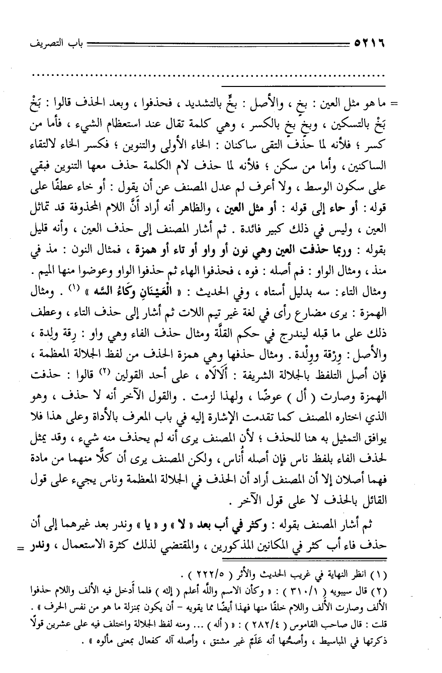 ما هو مثل العين: بخ، والأصل: بخّ بالتشديد، فحذفوا، وبعد الحذف قالوا: بخ بخ بالتسكين، وبخ بخ بالكسر، وهي كلمة تقال عند استعظام الشيء، فأما من كسر؛ فلأنه لما حذف التقى ساكنان: الخاء الأولى والتنوين؛ فكسر الخاء لالتقاء الساكنين، وأما من سكن؛ فلأنه لما حذف لام الكلمة حذف معها التنوين فبقي على سكون الوسط، ولا أعرف لم عدل المصنف عن أن يقول: أو خاء عطفا على قوله: أو حاء إلى قوله: أو مثل العين، والظاهر أنه أراد أنّ اللام المحذوفة قد تماثل العين، وليس في ذلك كبير فائدة. ثم أشار المصنف إلى حذف العين، وأنه قليل بقوله: وربما حذفت العين وهي نون أو واو أو تاء أو همزة، فمثال النون: مذ في منذ، ومثال الواو: فم أصله: فوه، فحذفوا الهاء ثم حذفوا الواو وعوضوا منها الميم.