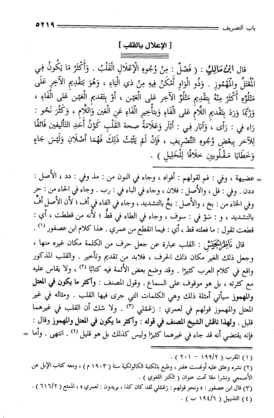 قال ابن مالك: (فصل: من وجوه الإعلال القلب. وأكثر ما يكون في المعتلّ والمهموز. وذو الواو أمكن فيه من ذي الياء، وهو بتقديم الآخر على متلوّه أكثر منه بتقديم متلوّ الآخر على العين، أو بتقديم العين على الفاء، وربّما ورد بتقديم اللّام على الفاء وبتأخير الفاء عن العين واللّام، وكثر نحو: