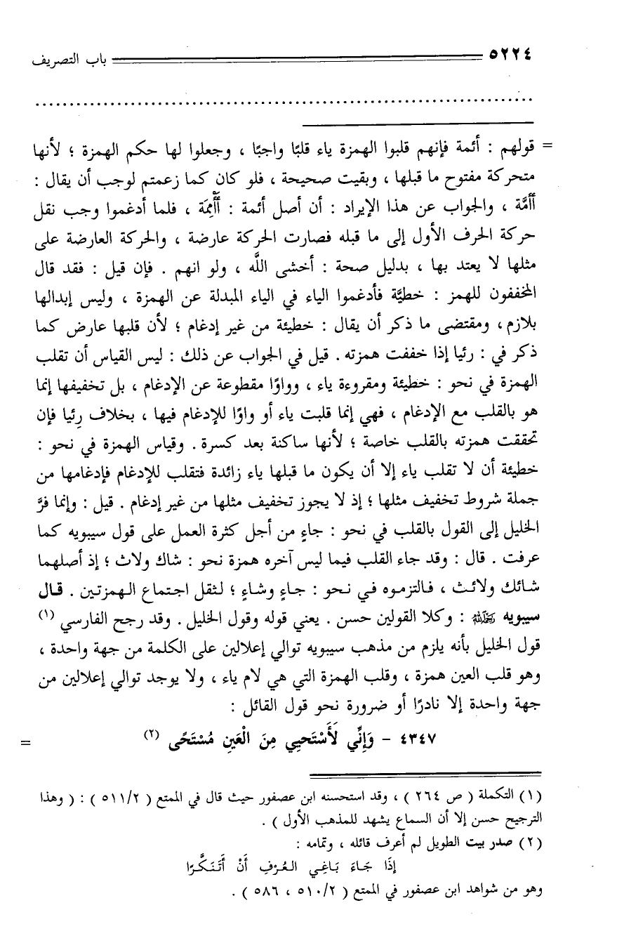 أأمّة، والجواب عن هذا الإيراد: أن أصل أئمة: أأممة، فلما أدغموا وجب نقل حركة الحرف الأول إلى ما قبله فصارت الحركة عارضة، والحركة العارضة على مثلها لا يعتد بها، بدليل صحة: أخشى الله، ولو انهم. فإن قيل: فقد قال المخففون للهمز: خطيّة فأدغموا الياء في الياء المبدلة عن الهمزة، وليس إبدالها بلازم، ومقتضى ما ذكر أن يقال: خطيئة من غير إدغام؛ لأن قلبها عارض كما ذكر في: رئيا إذا خففت همزته. قيل في الجواب عن ذلك: ليس القياس أن تقلب الهمزة في نحو: خطيئة ومقروءة ياء، وواوا مقطوعة عن الإدغام، بل تخفيفها إنما هو بالقلب مع الإدغام، فهي إنما قلبت ياء أو واوا للإدغام فيها، بخلاف رئيا فإن تحققت همزته بالقلب خاصة؛ لأنها ساكنة بعد كسرة. وقياس الهمزة في نحو: