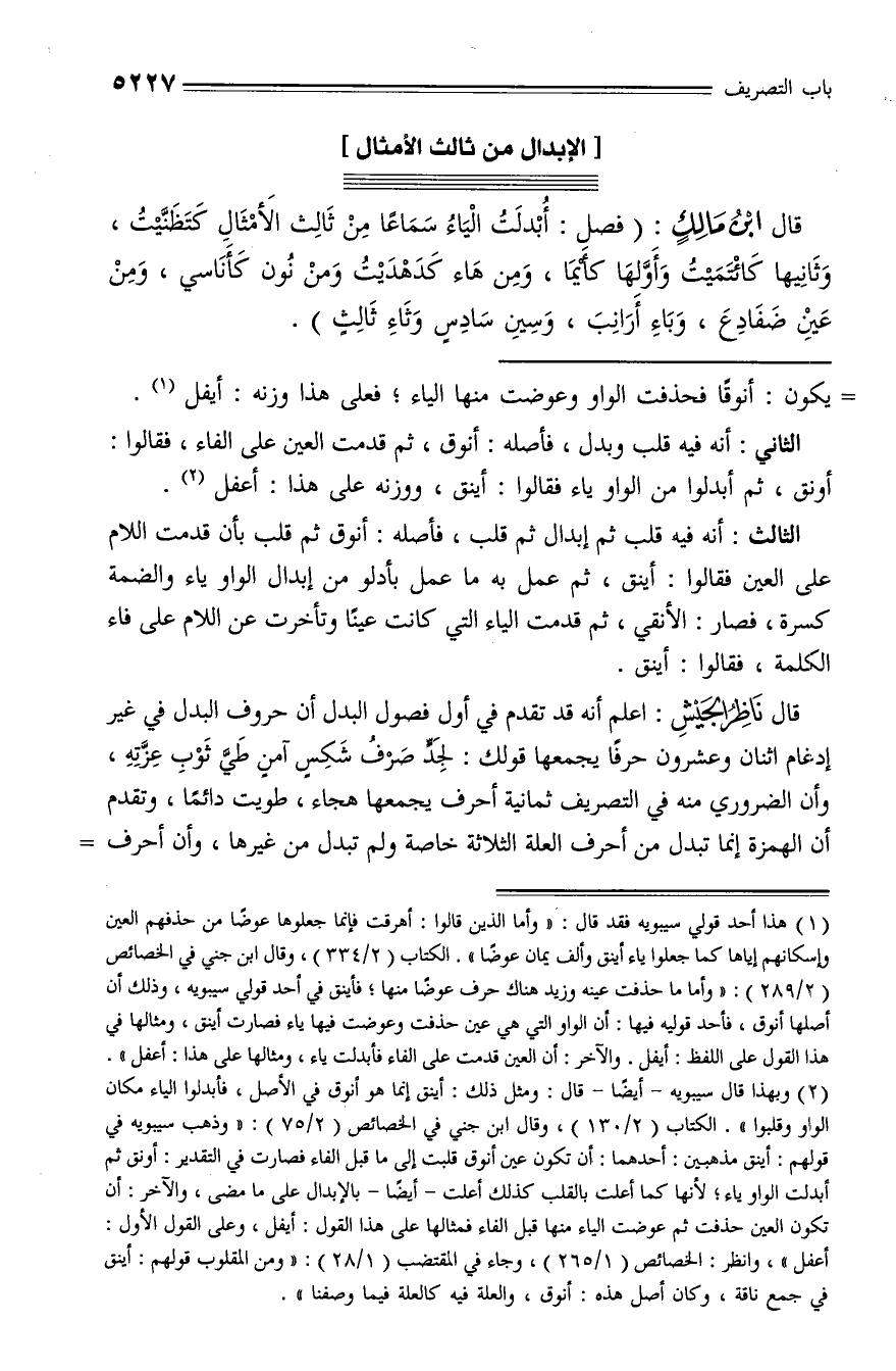 (¬2) وبهذا قال سيبويه - أيضا - قال: ومثل ذلك: أينق إنما هو أنوق في الأصل، فأبدلوا الياء مكان الواو وقلبوا». الكتاب (2/ 130)، وقال ابن جني في الخصائص (2/ 75): «وذهب سيبويه في قولهم: أينق مذهبين: أحدهما: أن تكون عين أنوق قلبت إلى ما قبل الفاء فصارت في التقدير: أونق ثم أبدلت الواو ياء؛ لأنها كما أعلت بالقلب كذلك أعلت - أيضا - بالإبدال على ما مضى، والآخر: أن تكون العين حذفت ثم عوضت الياء منها قبل الفاء فمثالها على هذا القول: أيفل، وعلى القول الأول: