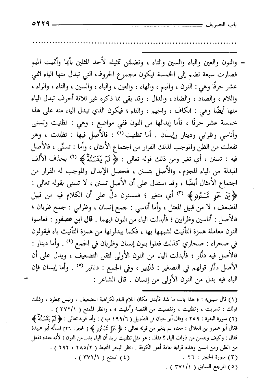 (¬2) سورة البقرة: 259، وقال أبو حيان في التذييل (6/ 199 ب): وأما قوله تعالى: لَمْ يَتَسَنَّهْ فقال أبو عمرو بن العلال: معناه لم يتغير من قوله تعالى: حَمَإٍ مَسْنُونٍ [الحجر: 26] فسأله أبو عبيدة فقال: وكيف ويتسن من ذوات الياء؟ فقال: هو مثل تظنيت يريد أن الياء بدل من