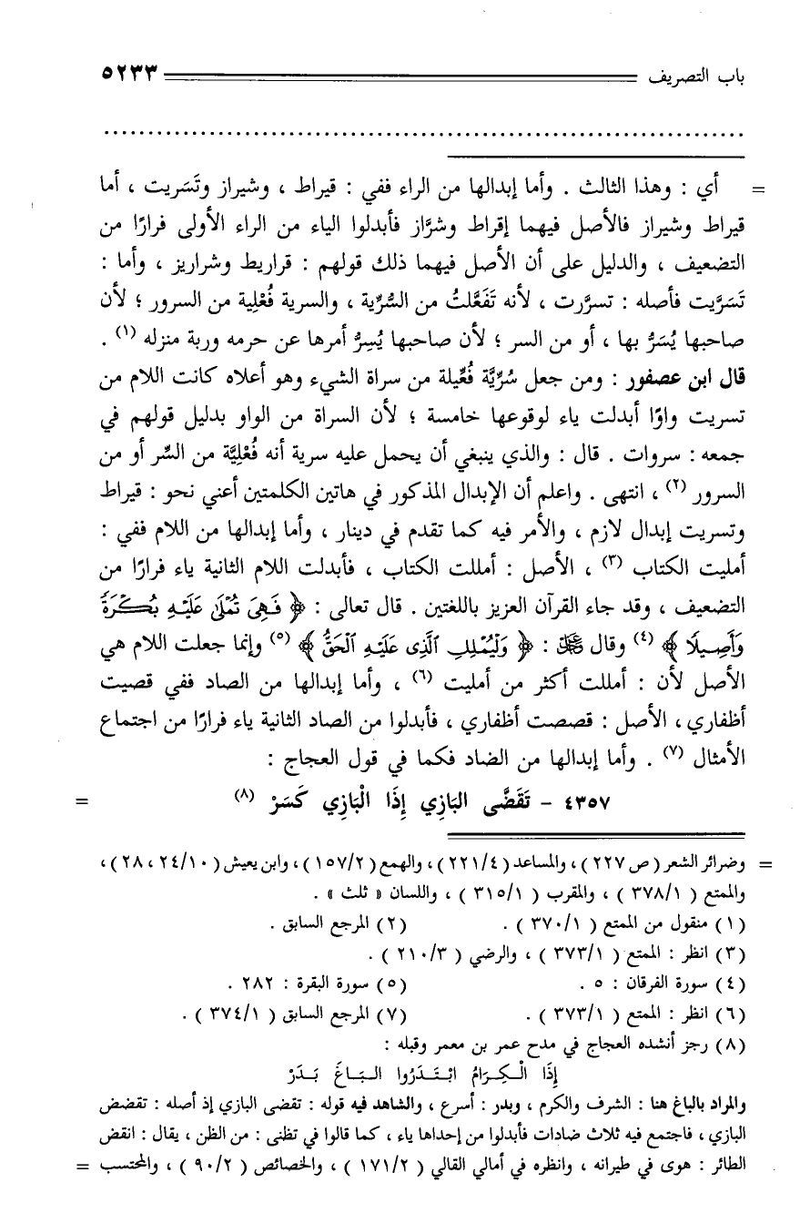قال ابن عصفور: ومن جعل سرّيّة فعّيلة من سراة الشيء وهو أعلاه كانت اللام من تسريت واوا أبدلت ياء لوقوعها خامسة؛ لأن السراة من الواو بدليل قولهم في جمعه: سروات. قال: والذي ينبغي أن يحمل عليه سرية أنه فعليّة من السّر أو من السرور (¬2)، انتهى. واعلم أن الإبدال المذكور في هاتين الكلمتين أعني نحو: قيراط وتسريت إبدال لازم، والأمر فيه كما تقدم في دينار، وأما إبدالها من اللام ففي: