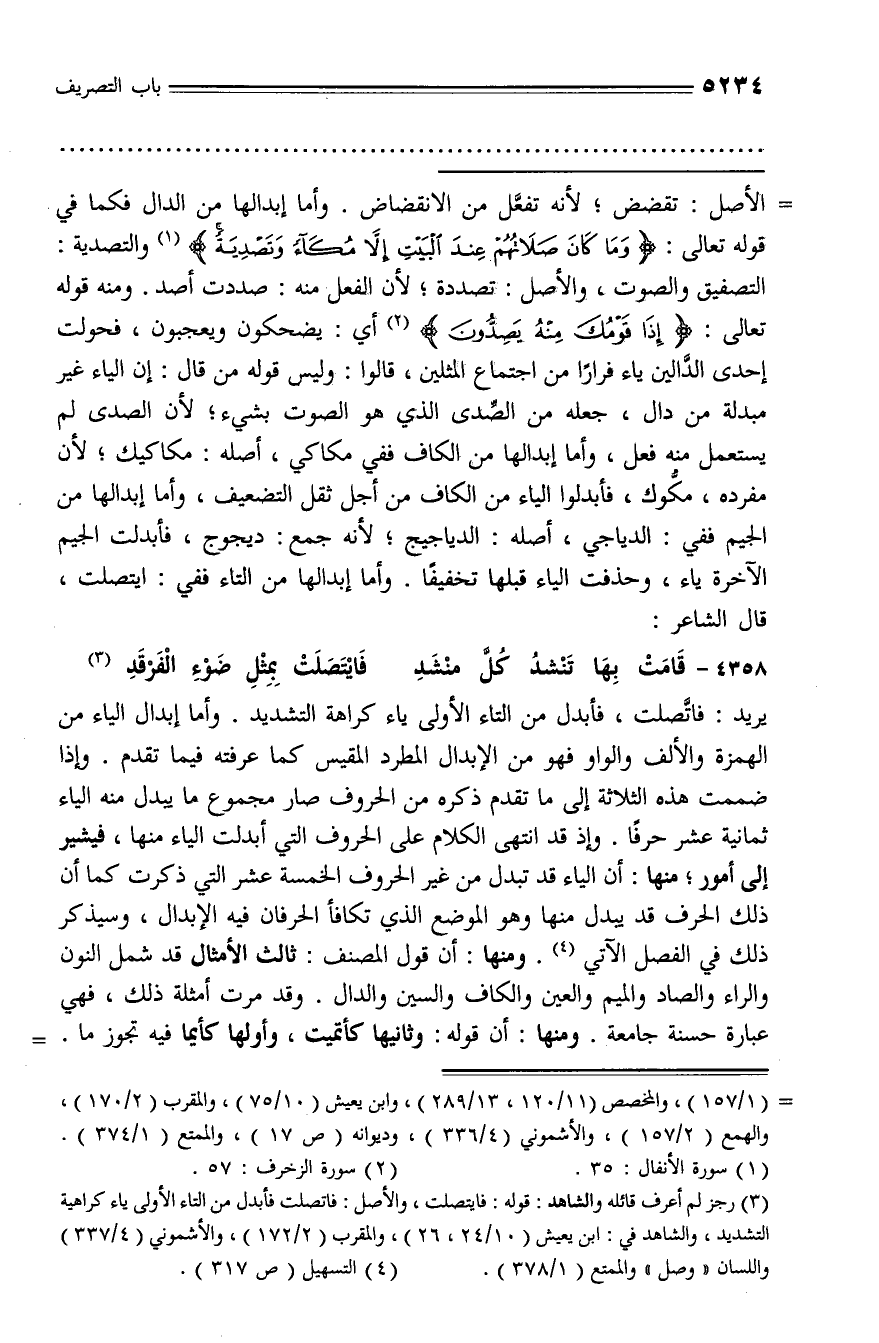 التصفيق والصوت، والأصل: تصددة؛ لأن الفعل منه: صددت أصد. ومنه قوله تعالى: إِذا قَوْمُكَ مِنْهُ يَصِدُّونَ (¬2) أي: يضحكون ويعجبون، فحولت إحدى الدّالين ياء فرارا من اجتماع المثلين، قالوا: وليس قوله من قال: إن الياء غير مبدلة من دال، جعله من الصّدى الذي هو الصوت بشيء؛ لأن الصدى لم يستعمل منه فعل، وأما إبدالها من الكاف ففي مكاكي، أصله: مكاكيك؛ لأن مفرده، مكّوك، فأبدلوا الياء من الكاف من أجل ثقل التضعيف، وأما إبدالها من الجيم ففي: الدياجي، أصله: الدياجيج؛ لأنه جمع: ديجوج، فأبدلت الجيم الآخرة ياء، وحذفت الياء قبلها تخفيفا. وأما إبدالها من التاء ففي: ايتصلت، قال الشاعر:
