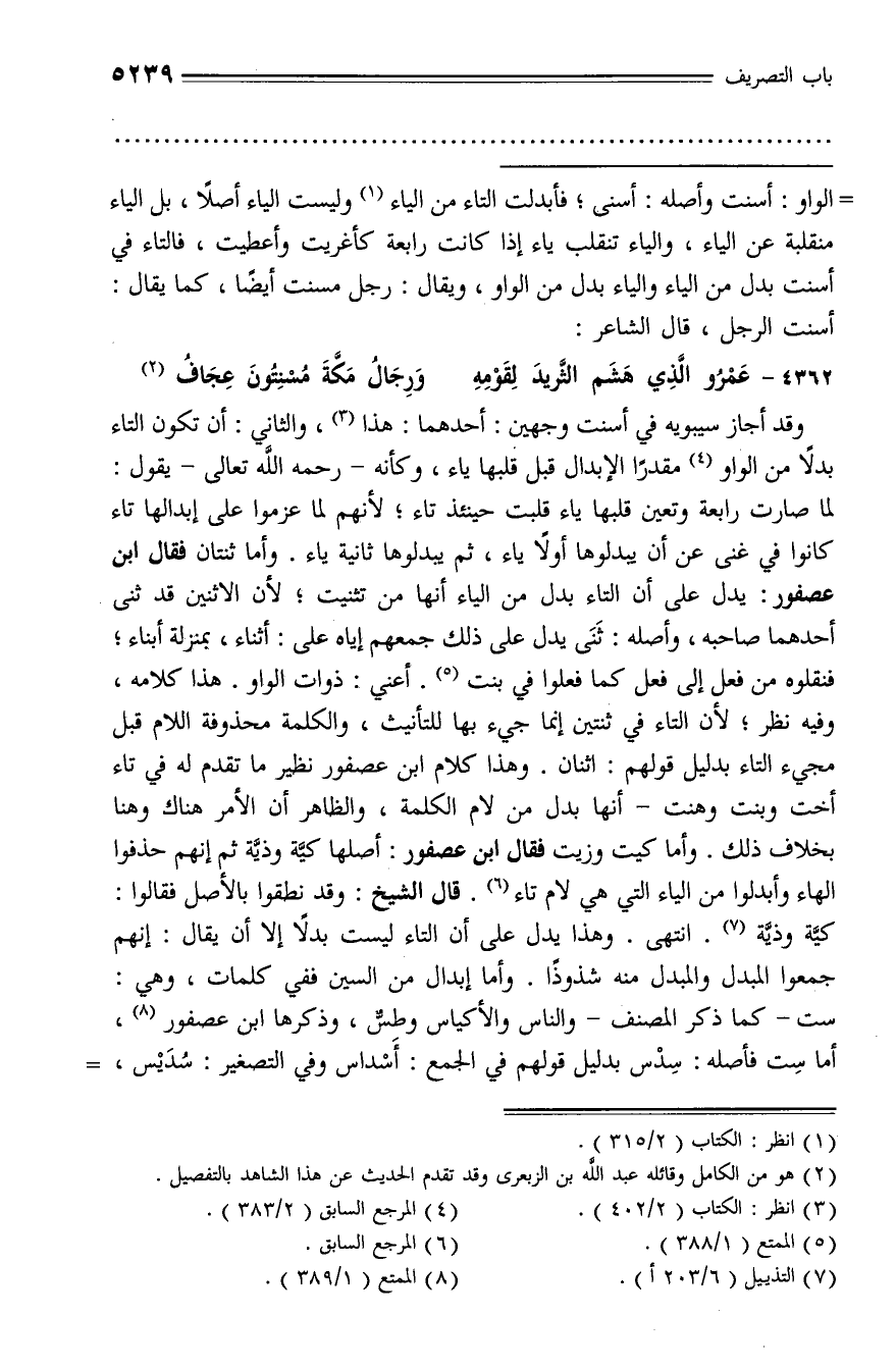 أولا ياء، ثم يبدلوها ثانية ياء. وأما ثنتان فقال ابن عصفور: يدل على أن التاء بدل من الياء أنها من تثنيت؛ لأن الاثنين قد ثنى أحدهما صاحبه، وأصله: ثنى يدل على ذلك جمعهم إياه على: أثناء، بمنزلة أبناء؛ فنقلوه من فعل إلى فعل كما فعلوا في بنت (¬5). أعني: ذوات الواو. هذا كلامه، وفيه نظر؛ لأن التاء في ثنتين إنما جيء بها للتأنيث، والكلمة محذوفة اللام قبل مجيء التاء بدليل قولهم: اثنان. وهذا كلام ابن عصفور نظير ما تقدم له في تاء أخت وبنت وهنت - أنها بدل من لام الكلمة، والظاهر أن الأمر هناك وهنا بخلاف ذلك. وأما كيت وزيت فقال ابن عصفور: أصلها كيّة وذيّة ثم إنهم حذفوا الهاء وأبدلوا من الياء التي هي لام تاء (¬6). قال الشيخ: وقد نطقوا بالأصل فقالوا: