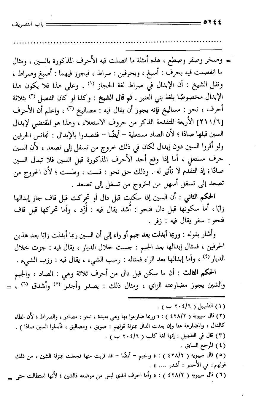 (¬2) قال سيبويه (2/ 428): «وربما ضارعوا بها وهي بعيدة، نحو: مصادر، والصراط؛ لأن الطاء كالدال، والمضارعة هنا وإن بعدت الدال بمنزلة قولهم: صويق، ومصاليق، فأبدلوا السين صادا).