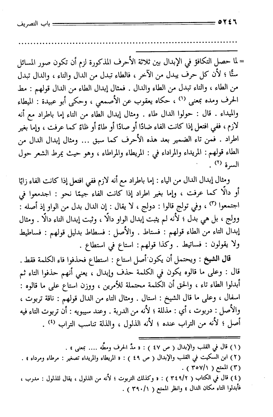 لما حصل التكافؤ في الإبدال بين ثلاثة الأحرف المذكورة لزم أن تكون صور المسائل ستّا؛ لأن كل حرف يبدل من الآخر، فالطاء تبدل من الدال والتاء، والدال تبدل من الطاء، والتاء تبدل من الطاء والدال. فمثال إبدال الطاء من الدال قولهم: مط الحرف ومده بمعنى (¬1)، حكاه يعقوب عن الأصمعي، وحكى أبو عبيدة: الميطاء والميداء. قال: حولوا الدال طاء. ومثال إبدال الطاء من التاء إما باطراد مع أنه لازم، ففي افتعل إذا كانت الفاء ضادا أو صادا أو طاء أو ظاء كما عرفت، وإما بغير اطراد. فمن تاء الضمير بعد هذه الأحرف كما سبق ... ومثال إبدال الدال من الطاء قولهم: المريداء والمراداء في: المريطاء والمراطاء، وهو حيث يمرط الشعر حول السرة (¬2).
