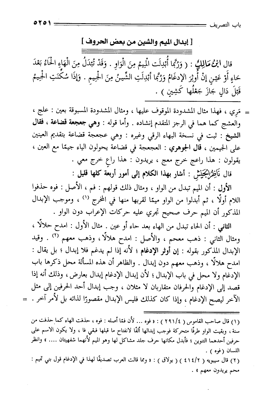 قال ابن مالك: (وربّما أبدلت الميم من الواو. وقد تبدل من الهاء الحاء بعد حاء أو عين إن أوثر الإدغام وربّما أبدلت الشّين من الجيم. وإذا سكّنت الجيم قبل دال جاز جعلها كشين).