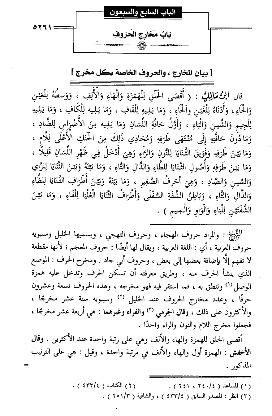 قال ابن مالك: (أقصى الحلق للهمزة والهاء والألف، ووسطه للعين والحاء، وأدناه للغين والخاء، وما يليه للقاف، وما يليه للكاف، وما يليه للجيم والشّين والياء، وأوّل حافّة اللّسان وما يليه من الأضراس للضّاد، وما دون حافّته إلى منتهى طرفه ومحاذي ذلك من الحنك الأعلى للّام، وما بين طرفه وفويق الثّنايا للنّون والرّاء وهي أدخل في ظهر اللّسان قليلا، وما بين طرفه وأصول الثّنايا للطّاء والدّال والتّاء، وما بينه وبين الثّنايا للزّاي والسّين والصّاد، وهي أحرف الصّفير، وما بينه وبين أطراف الثّنايا للظّاء والذّال والثّاء، وباطن الشّفة السّفلى وأطراف الثّنايا العليا للفاء، وما بين الشّفتين للباء والواو والميم).