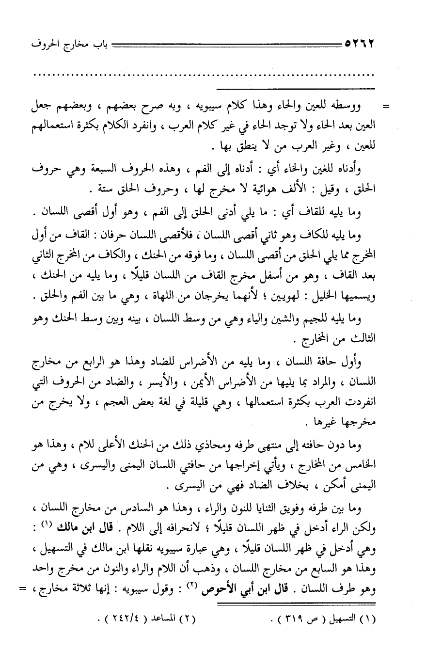 ووسطه للعين والحاء وهذا كلام سيبويه، وبه صرح بعضهم، وبعضهم جعل العين بعد الحاء ولا توجد الحاء في غير كلام العرب، وانفرد الكلام بكثرة استعمالهم للعين، وغير العرب من لا ينطق بها.