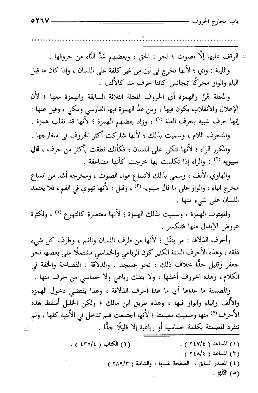 والمصمتة ما عداها أي ما عدا أحرف الذلاقة، وهذا يقتضي دخول الهمزة والألف والياء والواو فيها، وهذه طريق ابن مالك؛ ولكن الخليل أسقط هذه الأحرف (¬5) منها وسميت مصمتة؛ لأنها اجتمعت فلم تدخل في الأبنية كلها، ولم تنفرد المصمتة بكلمة خماسية أو رباعية إلا قليلا جدّا. -