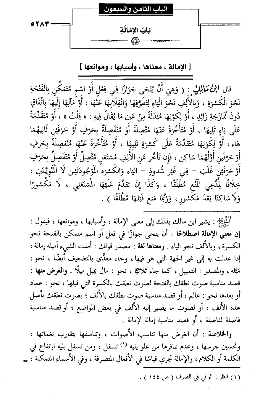الشّرح: يشير ابن مالك بذلك إلى معنى الإمالة، وأسبابها، وموانعها، فيقول: