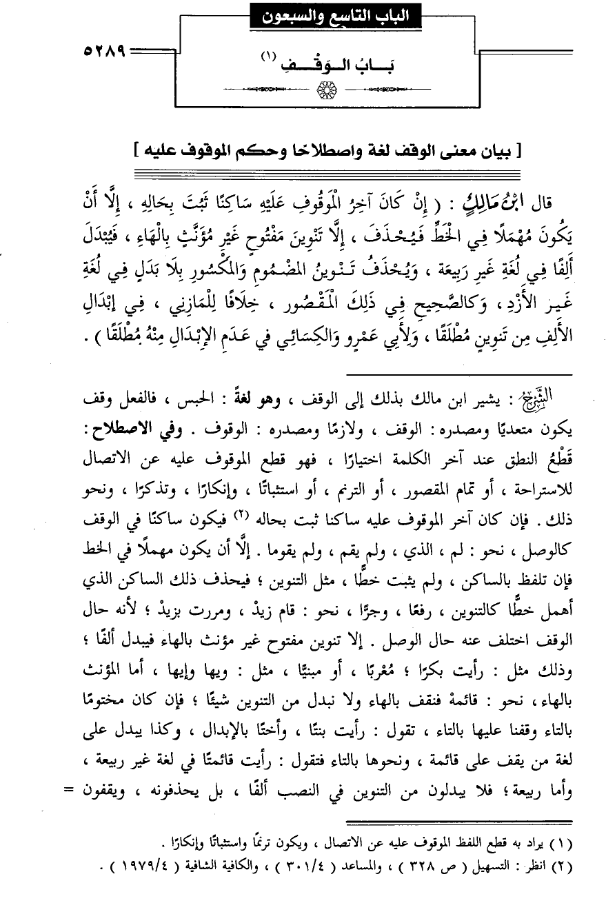 - الشّرح: يشير ابن مالك بذلك إلى الوقف، وهو لغة: الحبس، فالفعل وقف يكون متعديا ومصدره: الوقف، ولازما ومصدره: الوقوف. وفي الاصطلاح:
