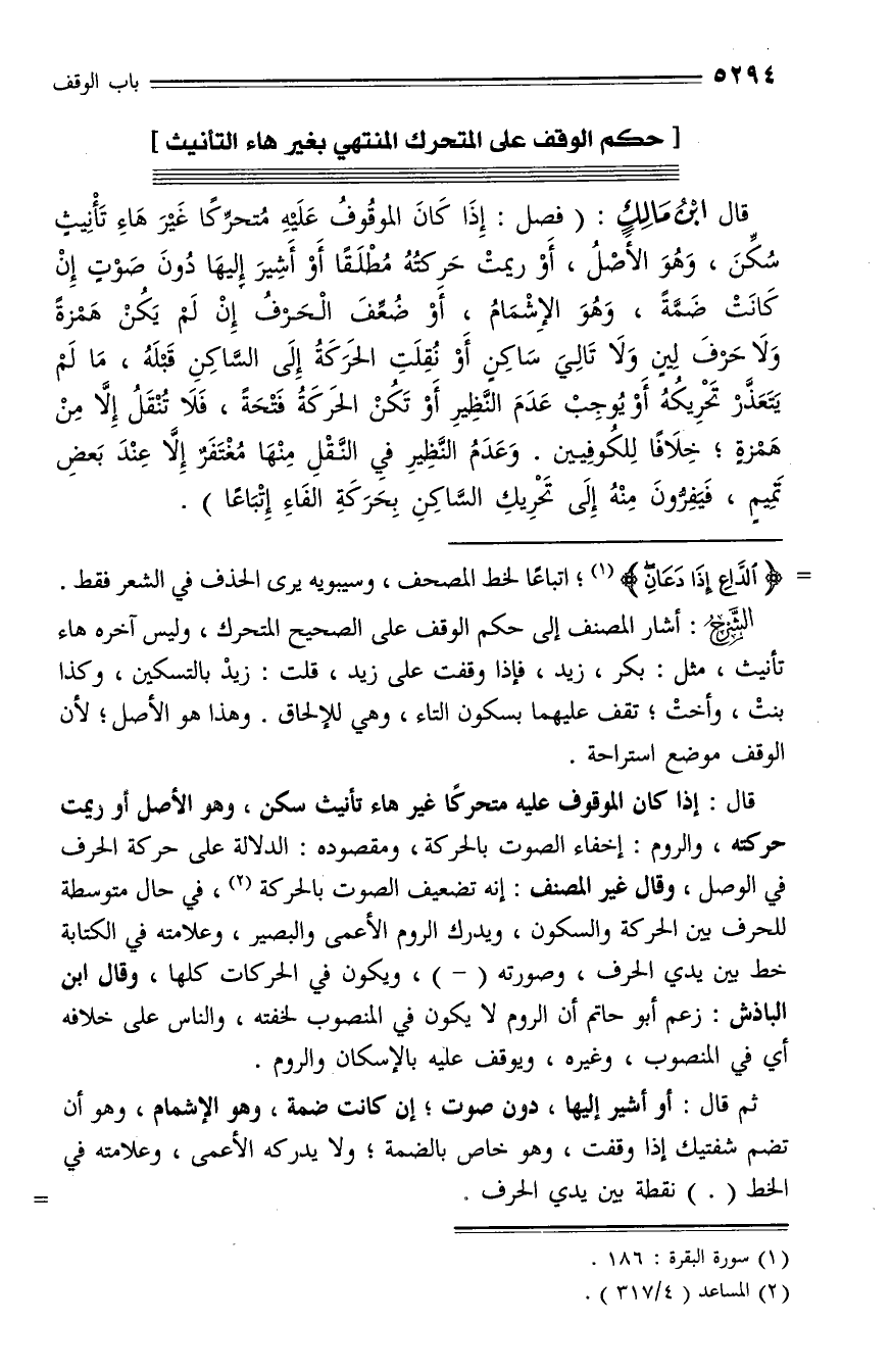 قال ابن مالك: (فصل: إذا كان الموقوف عليه متحرّكا غير هاء تأنيث سكّن، وهو الأصل، أو ريمت حركته مطلقا أو أشير إليها دون صوت إن كانت ضمّة، وهو الإشمام، أو ضعّف الحرف إن لم يكن همزة ولا حرف لين ولا تالي ساكن أو نقلت الحركة إلى السّاكن قبله، ما لم يتعذّر تحريكه أو يوجب عدم النّظير أو تكن الحركة فتحة، فلا تنقل إلّا من همزة؛ خلافا للكوفيين. وعدم النّظير في النّقل منها مغتفر إلّا عند بعض تميم، فيفرّون منه إلى تحريك السّاكن بحركة الفاء إتباعا).