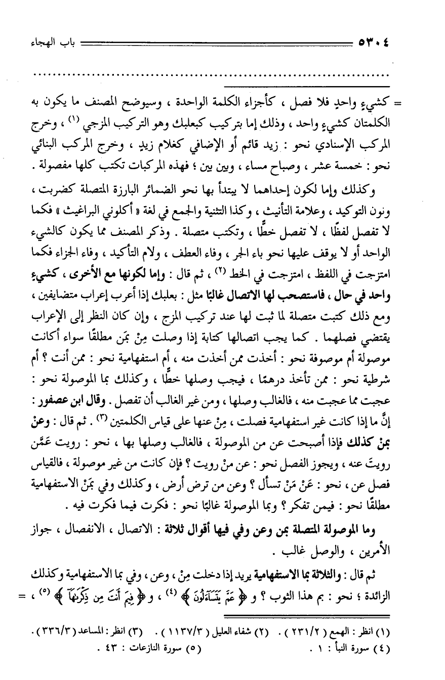 إنّ ما إذا كانت غير استفهامية فصلت، من عنها على قياس الكلمتين (¬3). ثم قال: وعن بمن كذلك فإذا أصبحت عن من الموصولة، فالغالب وصلها بها، نحو: رويت عمّن رويت عنه، ويجوز الفصل نحو: عن من رويت؟ فإن كانت من غير موصولة، فالقياس فصل عن، نحو: عن من تسأل؟ وعن من ترض أرض، وكذلك وفي بمن الاستفهامية مطلقا نحو: فيمن تفكر؟ وبما الموصولة غالبا نحو: فكرت فيما فكرت فيه.