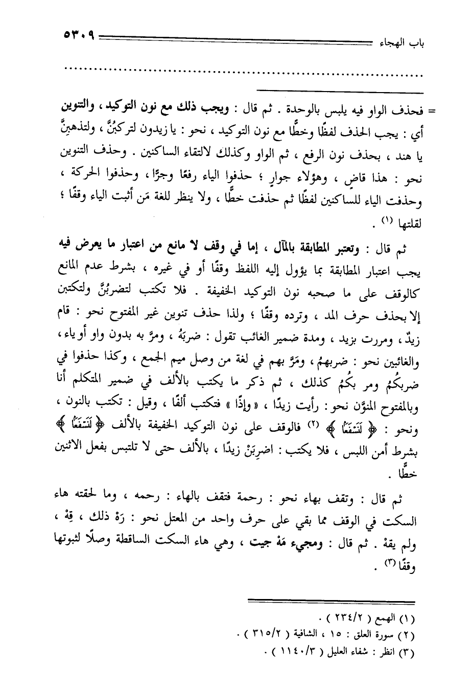 ثم قال: وتعتبر المطابقة بالمآل، إما في وقف لا مانع من اعتبار ما يعرض فيه يجب اعتبار المطابقة بما يؤول إليه اللفظ وقفا أو في غيره، بشرط عدم المانع كالوقف على ما صحبه نون التوكيد الخفيفة. فلا تكتب لتضربنّ ولتكتبن إلا بحذف حرف المد، وترده وقفا؛ ولذا حذف تنوين غير المفتوح نحو: قام زيد، ومررت بزيد، ومدة ضمير الغائب تقول: ضربه، ومرّ به بدون واو أو ياء، والغائبين نحو: ضربهم، ومرّ بهم في لغة من وصل ميم الجمع، وكذا حذفوا في ضربكم ومر بكم كذلك، ثم ذكر ما يكتب بالألف في ضمير المتكلم أنا وبالمفتوح المنوّن نحو: رأيت زيدا، «وإذا» فتكتب ألفا، وقيل: تكتب بالنون، ونحو: لَنَسْفَعاً (¬2) فالوقف على نون التوكيد الخفيفة بالألف لَنَسْفَعاً بشرط أمن اللبس، فلا يكتب: اضربن زيدا، بالألف حتى لا تلتبس بفعل الاثنين خطّا.